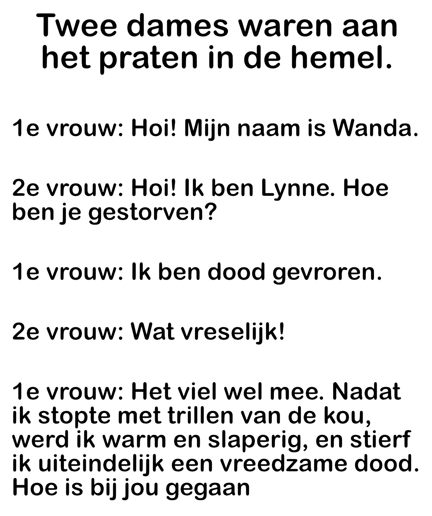 Wanda: “Het was eigenlijk niet zo erg. Na een tijdje stopte ik met rillen, werd ik warm en slaperig, en uiteindelijk 0verleed ik rustig. En hoe zit het met jou?”