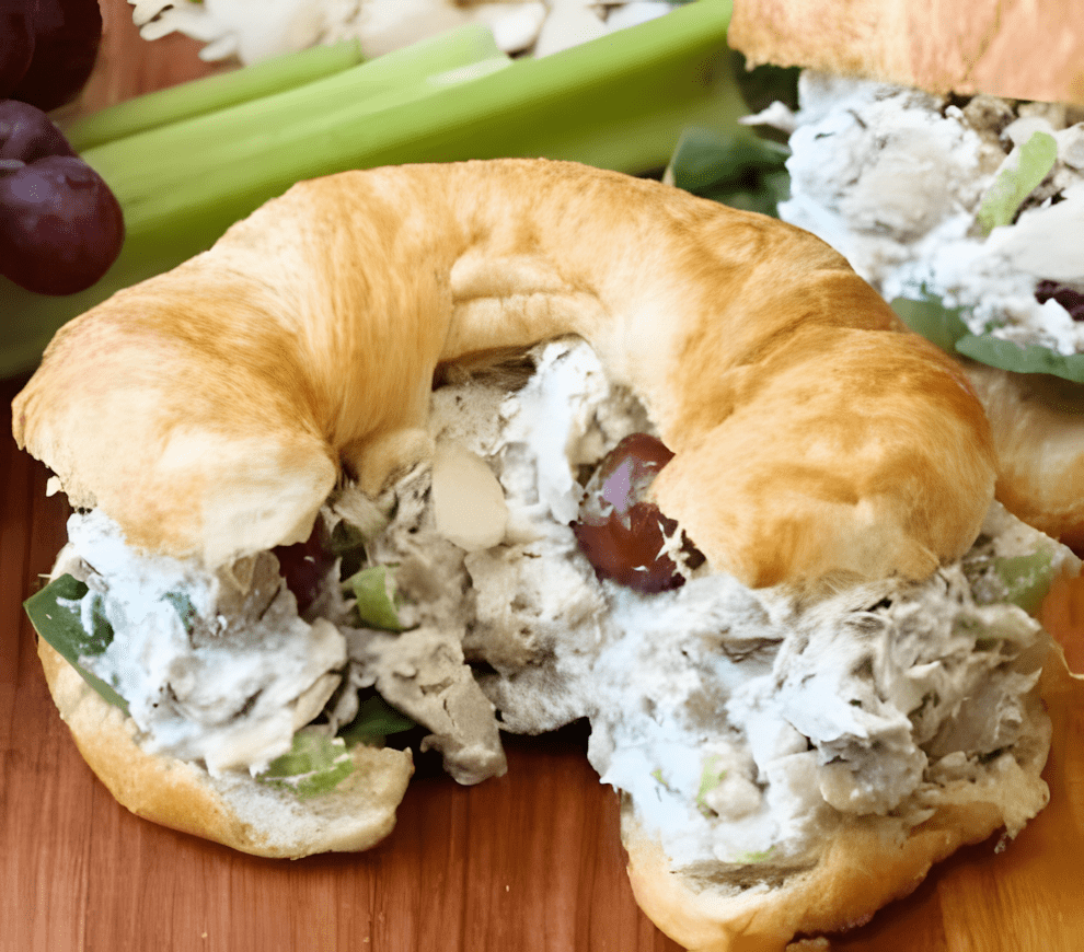 Deze klassieke kip kerrie salade croissant sandwich is de perfecte balans tussen romig, knapperig en zoet! 😍 Met malse gepluisde kip, knapperige selderij, sappige druiven en knapperige amandelen, allemaal gehuld in een romige dressing en geserveerd op een boterachtige croissant, is het pure perfectie voor lunch, picknicks of brunch! 🍽️✨ Alsof de zon schijnt in elke hap! ☀️