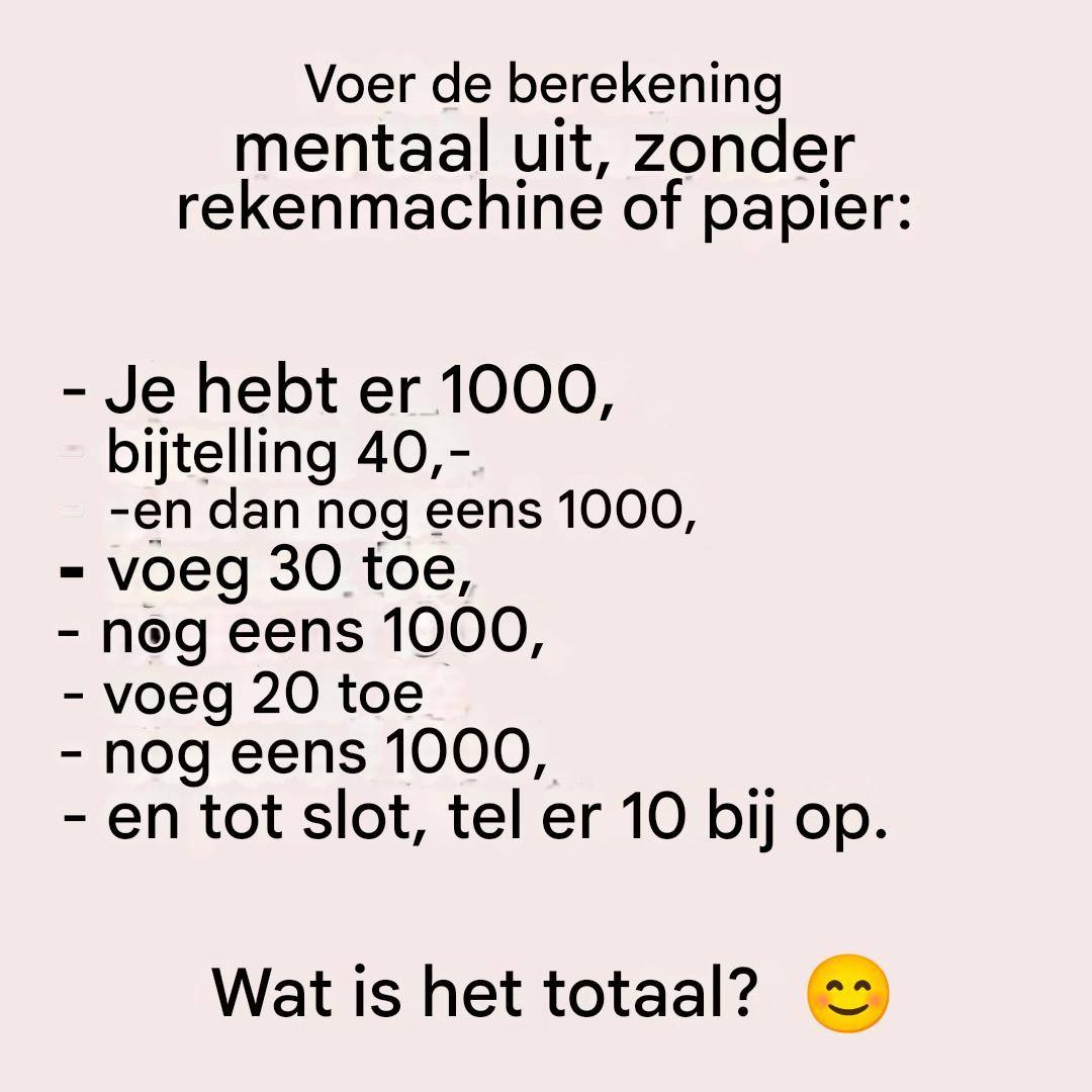 Op het eerste gezicht lijkt deze uitdaging een opgave voor de basisschool. Niets intimiderends, geen duidelijke valkuilen, gewoon een reeks nette optellingen. En toch… vraag het maar eens rond en je zult zien dat de antwoorden uiteenlopen. Velen roepen trots 5.000, vol vertrouwen in hun antwoord. En ze hebben het mis. Wat gebeurt er nu eigenlijk in onze hersenen wanneer we geconfronteerd worden met deze bedrieglijk eenvoudige hoofdrekening?