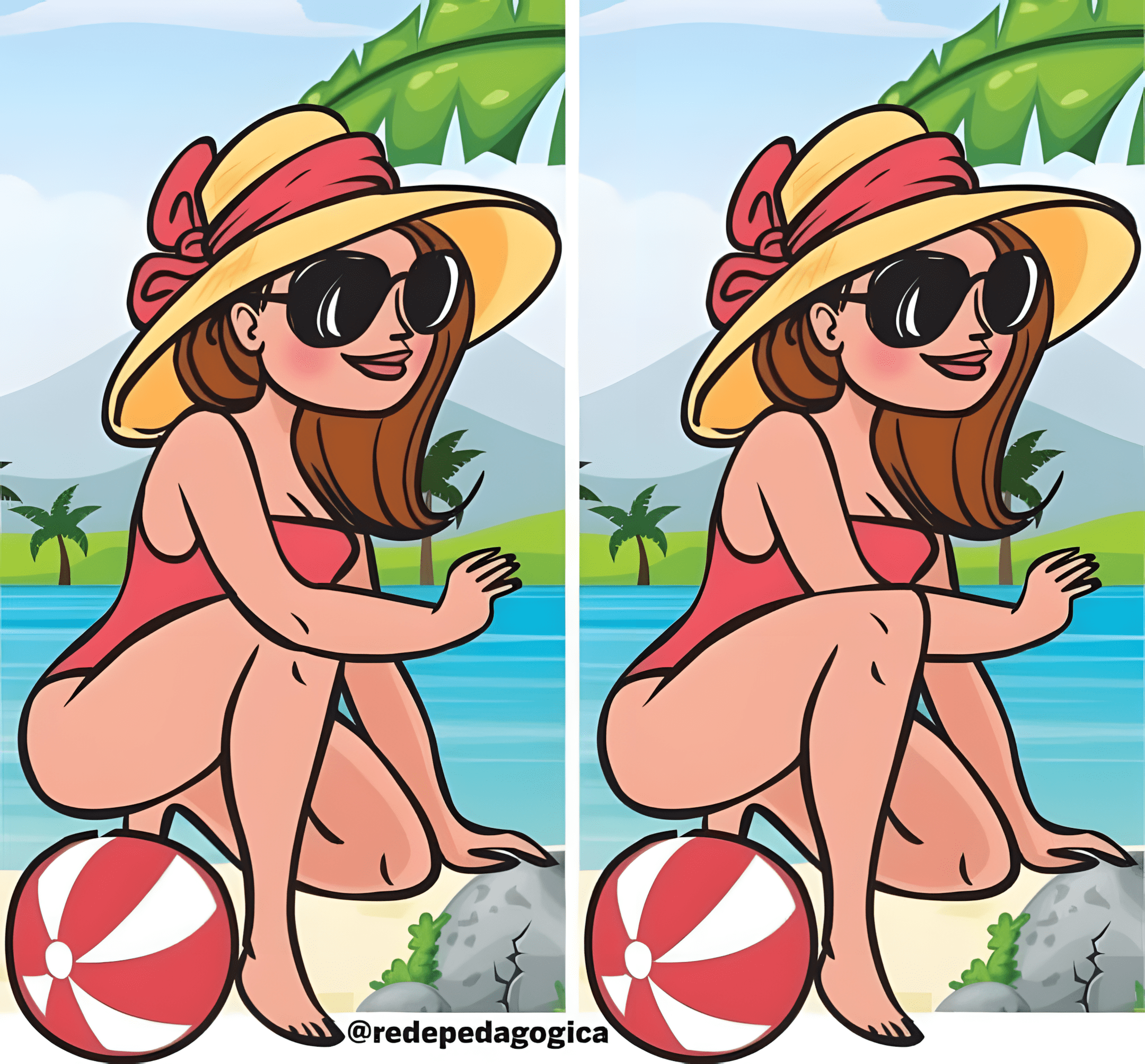 De scène lijkt simpel: een vrouw hurkt aan de waterkant, gekleed in een rood badpak, een hoed, een zonnebril, een strandbal aan haar voeten en een prachtig tropisch uitzicht op de achtergrond. Maar als je goed kijkt, veranderen de details subtiel van beeld tot beeld. Dit spel, dat vaak aan kinderen wordt voorgesteld, is eigenlijk een uitstekende concentratie- en geheugenoefening voor alle leeftijden.