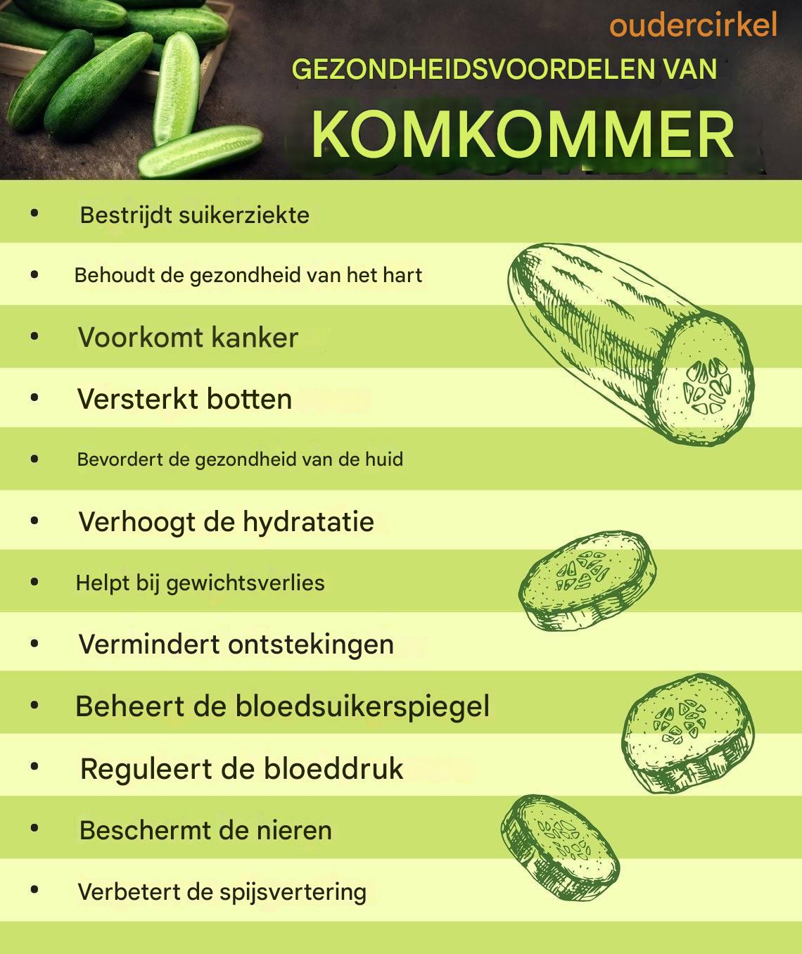 In dit artikel bespreken we de  zeven belangrijkste gezondheidsvoordelen van komkommers  en leggen we uit waarom het de moeite waard is om ze in uw dagelijkse voeding op te nemen.