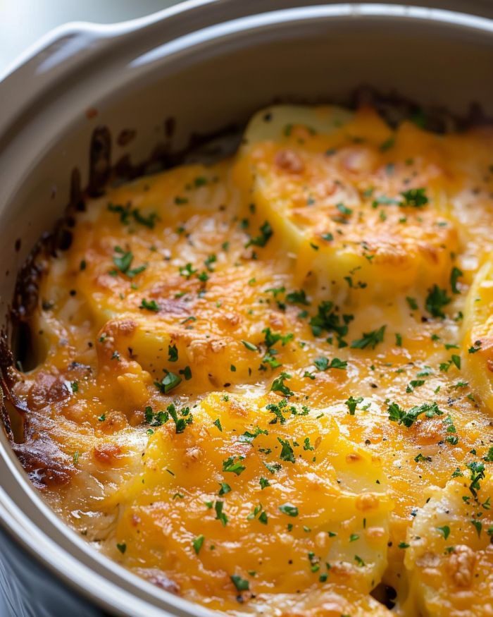 In de Franse keuken worden gegratineerde aardappelen gratin dauphinois genoemd, en ze zijn een geruststellende en geruststellende aanvulling op elke maaltijd. Hoewel dit recept doorgaans in de oven wordt gebakken, heb ik geïmproviseerd door het slowcooker-vriendelijk te maken, zodat het perfect in onze drukke schema’s past zonder de heerlijke, zachte textuur op te offeren die het gevolg is van slow cooking. Het gerecht krijgt een gewaagde wending door de toevoeging van knoflook en cheddar, die de romige textuur van de aardappelen aanvullen met sterke, geurige smaken die de tong zeker zullen plezieren. Probeer deze gegratineerde aardappelen met knoflook en cheddar als u op zoek bent naar een eenvoudig, smaakvol bijgerecht.
