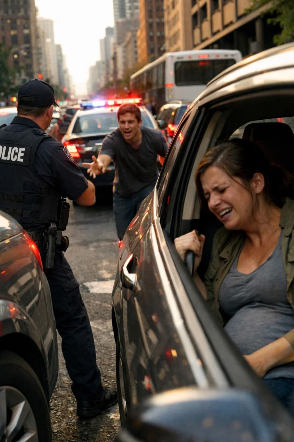 ‘Mijn vrouw,’ hijgde Ethan, de woorden struikelden over elkaar heen. ‘Ze heeft weeën. Ze zit vast in de auto achter me. Ze heeft pijn. Alsjeblieft.’