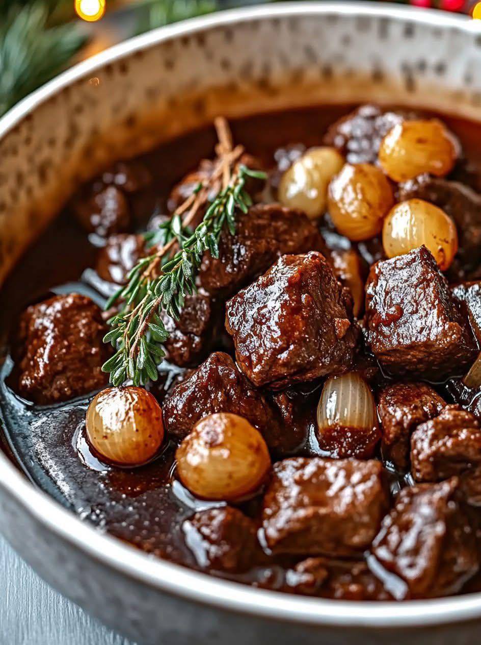 Aromatische rodewijn rundvlees & pareluitjes stifado