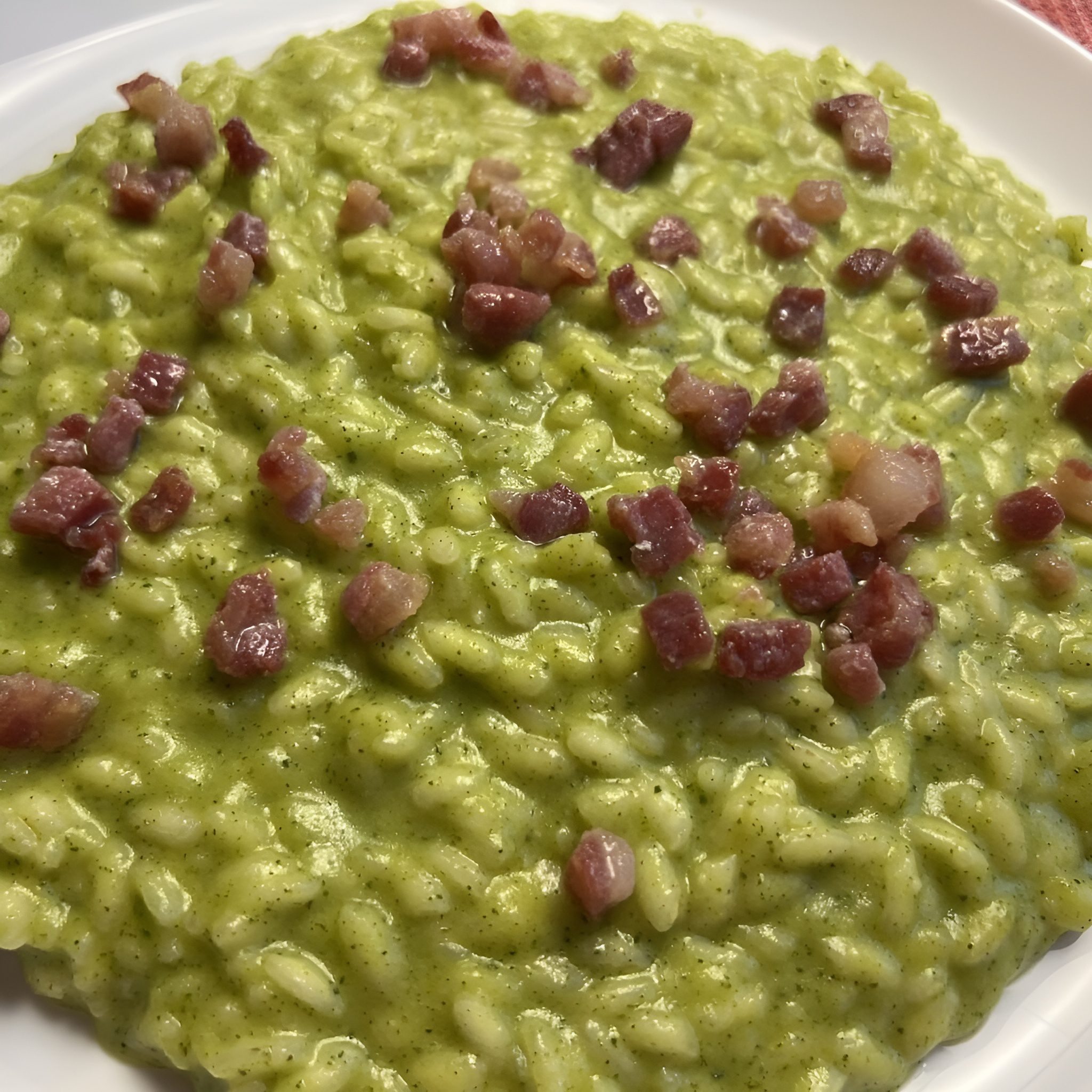 Romige courgetterisotto met krokante pancetta en amandelen 😍🍚🥓