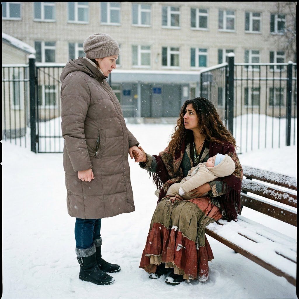 Ik haastte me naar het kraamziekenhuis om mijn zus te bezoeken en gooide, terwijl ik rende, wat kleingeld naar een zigeunervrouw met een baby bij de poort. Maar plotseling blokkeerde ze mijn weg, greep me stevig bij mijn pols en fluisterde: « Wacht hier. » Ik stond als versteend, ik begreep er niets van. En vijf minuten later zag ik iets waardoor mijn benen het begaven.