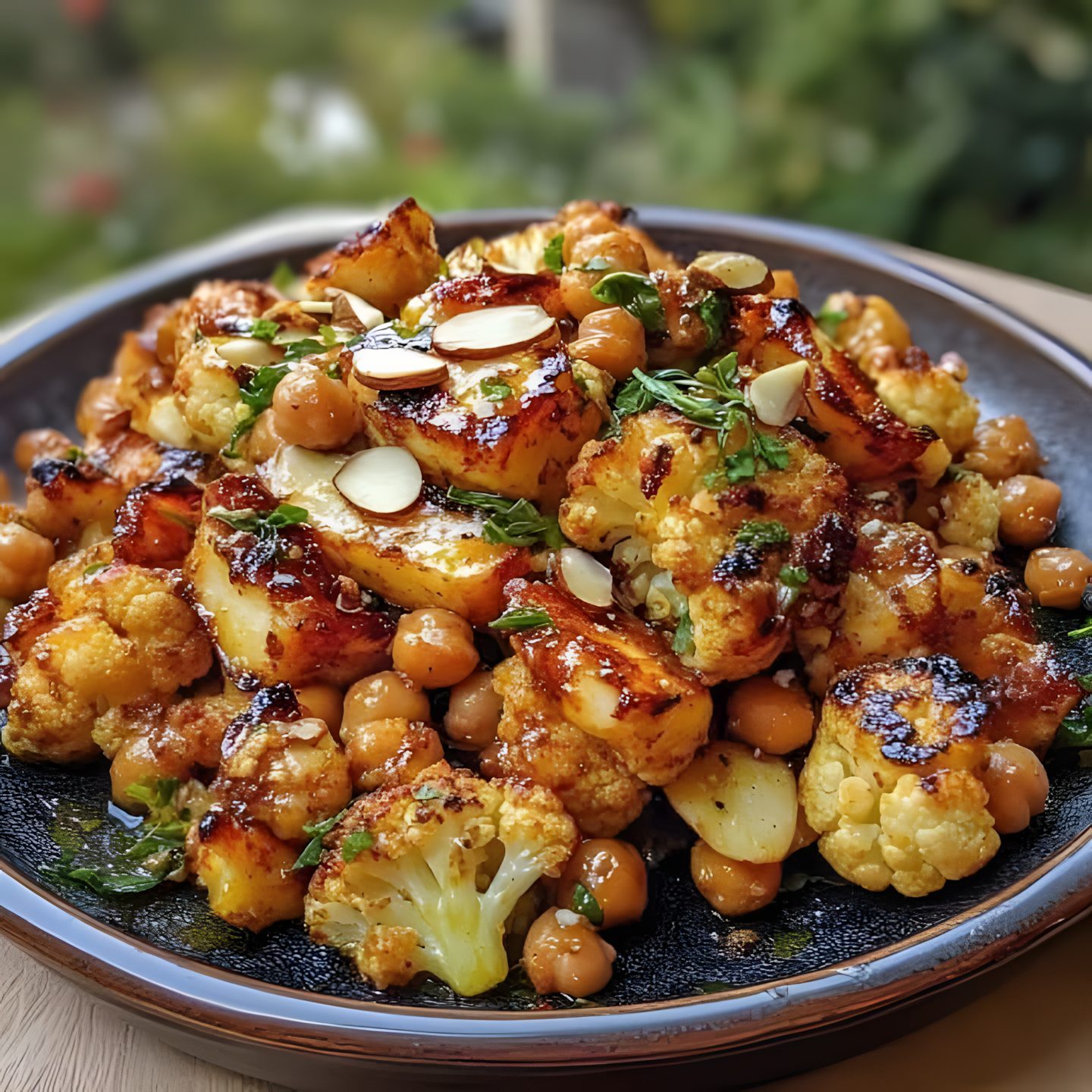 Deze smaakexplosie combineert perfect geroosterde bloemkool, goudbruine halloumi en knapperige kikkererwten, allemaal bedekt met een heerlijk zoet-kruidige honing-kerriesaus. Een gerecht dat barst van texturen en aroma’s – romig, knapperig en vol smaak! 😍🔥