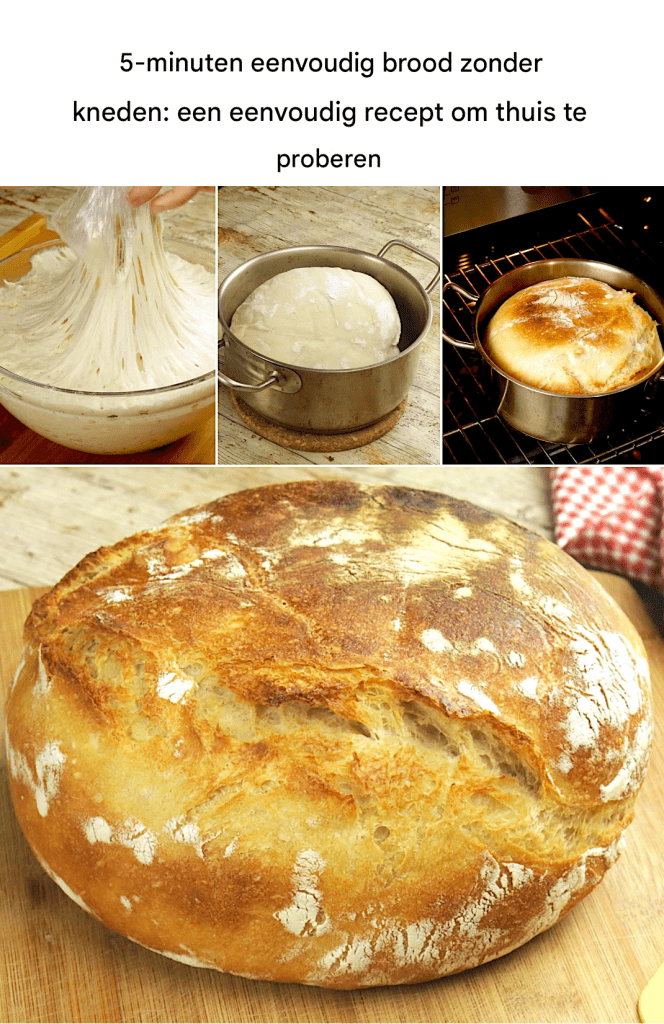Dit 5-minuten no-knead brood is een snelle en gemakkelijke manier om thuis vers brood te bakken zonder traditionele methoden. Gemaakt met slechts vijf ingrediënten – bloem, water, suiker, gist en zout – vereist dit recept slechts vijf minuten mixen, waarna het deeg mag rijzen. Het is perfect voor iedereen die van de smaak van vers brood houdt, maar het gedoe van kneden wil vermijden. Dit no-knead brood is ook perfect voor beginners, omdat het eenvoudig en gemakkelijk te maken is. Ben je op zoek naar een heerlijk en gemakkelijk broodrecept? Dan is dit iets voor jou!