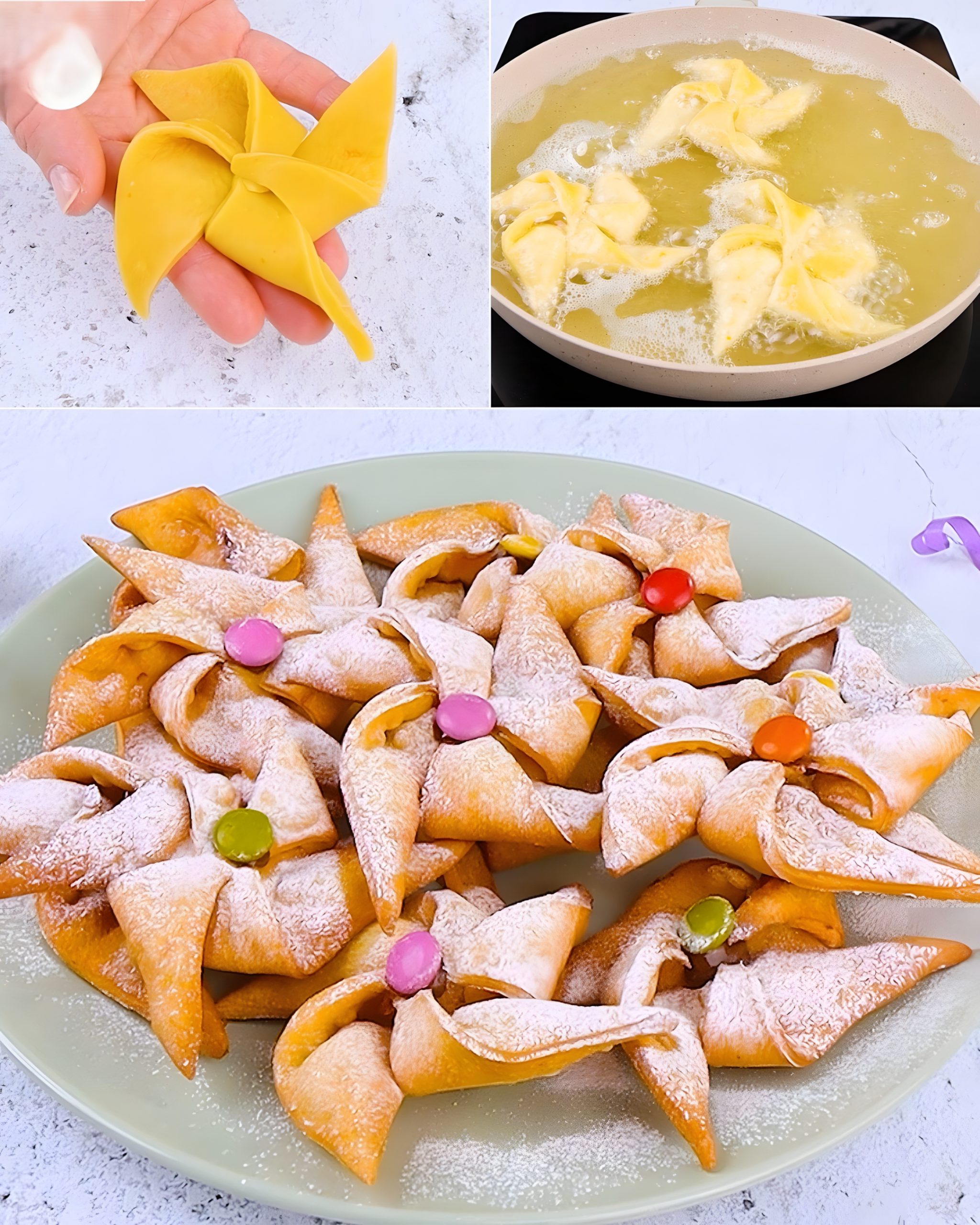 Deze traditionele Italiaanse « Girandole di Carnevale » zijn heerlijke gefrituurde molentjes gemaakt van zoet deeg met een vleugje likeur. Ze zijn licht, krokant en perfect gedecoreerd met hazelnootcrème en kleurrijke chocolaatjes. Ideaal voor Carnaval of een feestelijke traktatie! 🎉