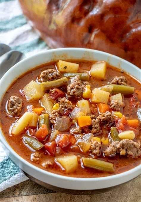 Rundvleessoep met groenten Ingrediënten: 1 pond rundergehakt 1 kleine ui, in blokjes gesneden 1 eetl. theelepel gehakte knoflook Zout en peper naar smaak 3 1/2 kopje runderbouillon 1 15 oz kan kleine in blokjes gesneden tomaten 1 blikje van 10,5 oz gecondenseerde tomatensoep 2 theelepels Worcestershiresaus 2 theelepels Italiaanse kruiden 1 zak van 16 oz … Lire plus