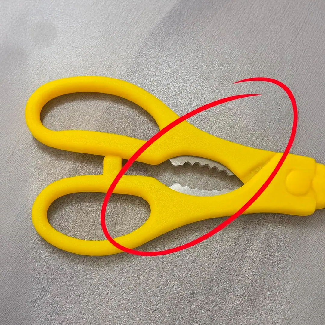 Bekijk je keukenschaar eens goed. Tussen de twee handvatten, waar je vingers van nature rusten, zit een gegroefd gedeelte. Wanneer je de handvatten een beetje sluit, grijpen deze tanden perfect in elkaar.