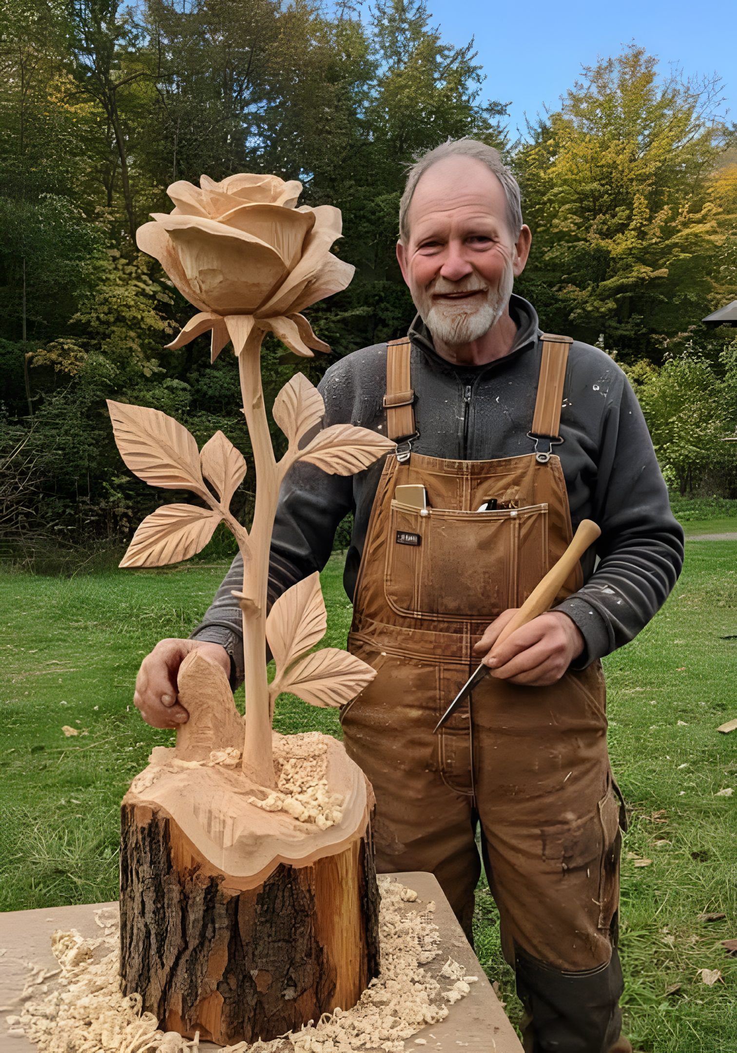 In een klein dorpje, omringd door bossen en groene velden, woonde een oude houtsnijder genaamd Thomas. Al sinds zijn jeugd had hij een passie voor houtbewerking. Zijn handen, gehard door jaren van noeste arbeid, konden van een simpel stuk hout iets prachtigs maken. Maar vandaag was een speciale dag. Vandaag voltooide hij zijn meesterwerk: een roos, volledig uit hout gesneden, alsof de natuur zelf haar in zijn handen had gelegd.