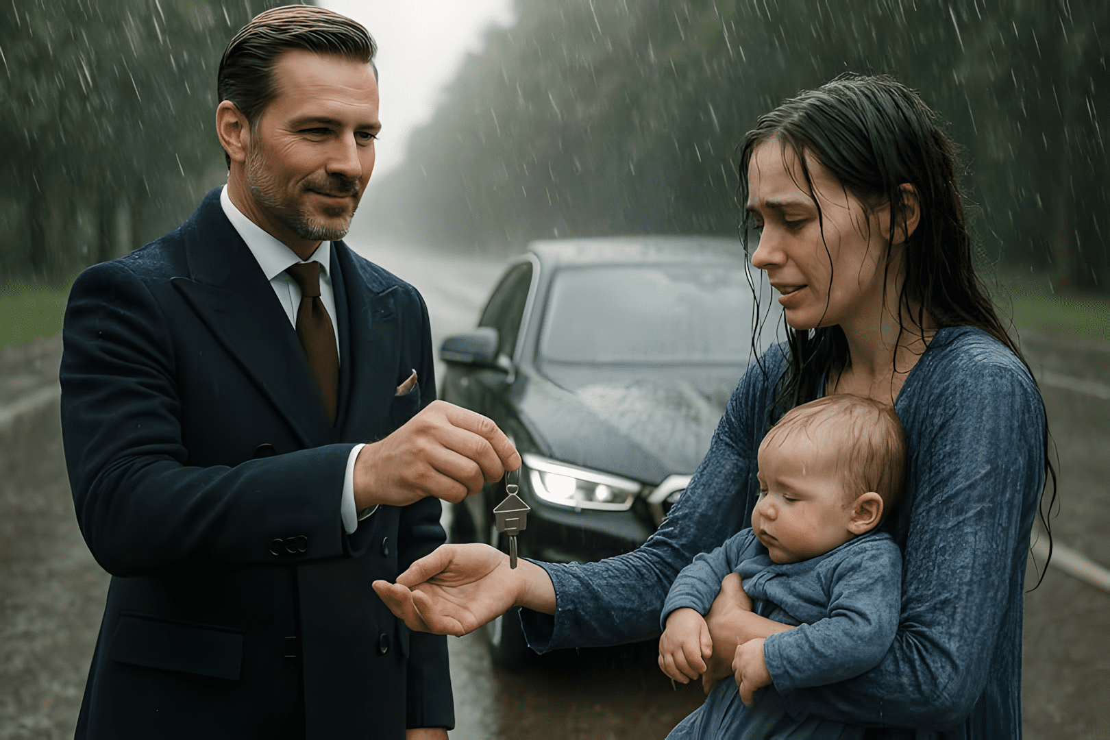 Op weg naar het vliegveld gaf miljonair Martin Delacroix de sleutels van zijn villa aan een doorweekte vrouw met een baby in haar armen… Maar wat hij bij terugkomst ontdekte, veranderde hem voorgoed…