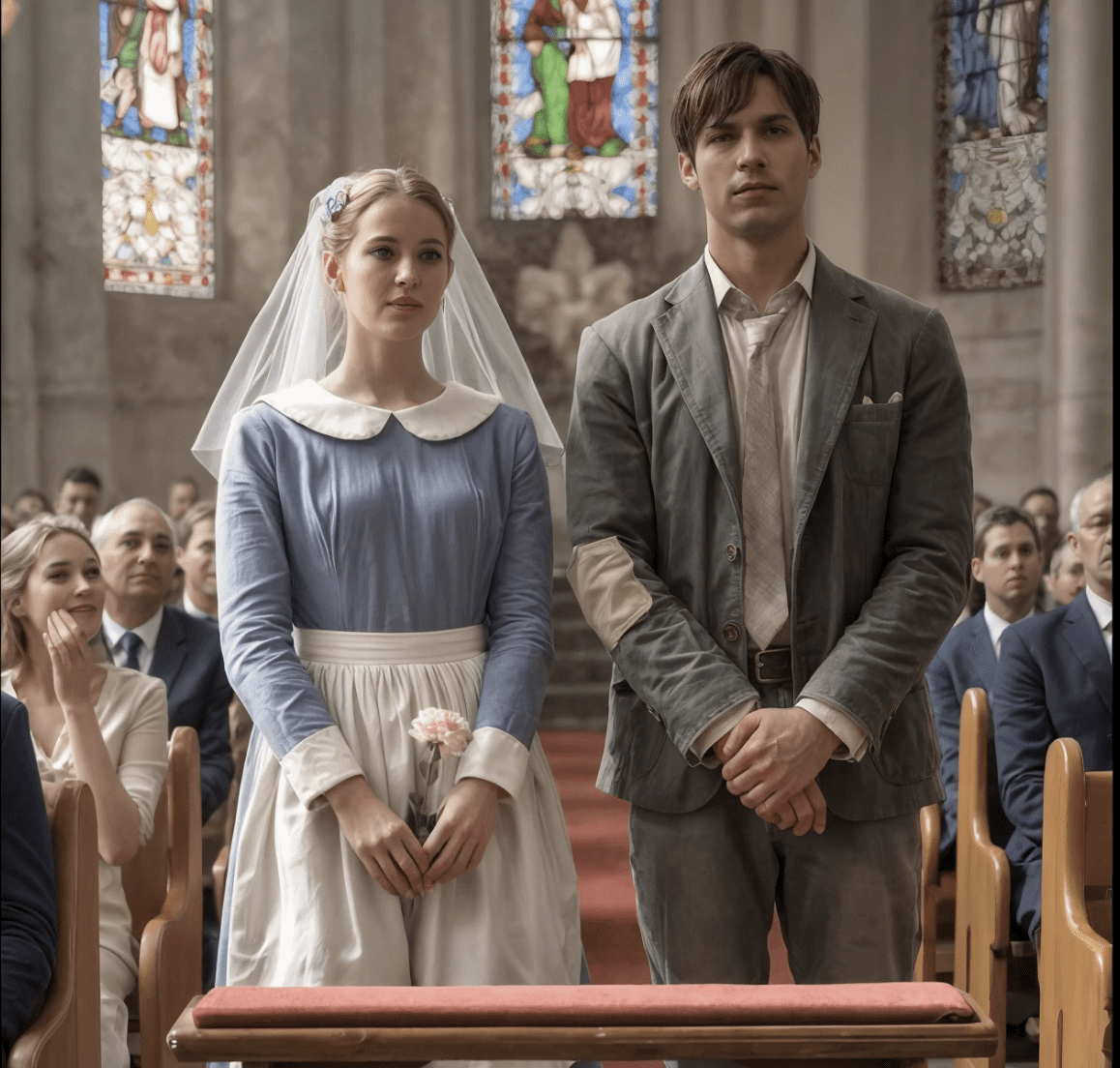 Emily Parker, een jonge kinderoppas, stond nerveus voor het altaar. Ze droeg een lichtblauwe jurk, een beetje verbleekt, met een eenvoudige sluier die ze met trillende handen op zijn plaats hield. In haar handpalm een ​​enkele roze anjer – de enige bloem die ze zich kon veroorloven.