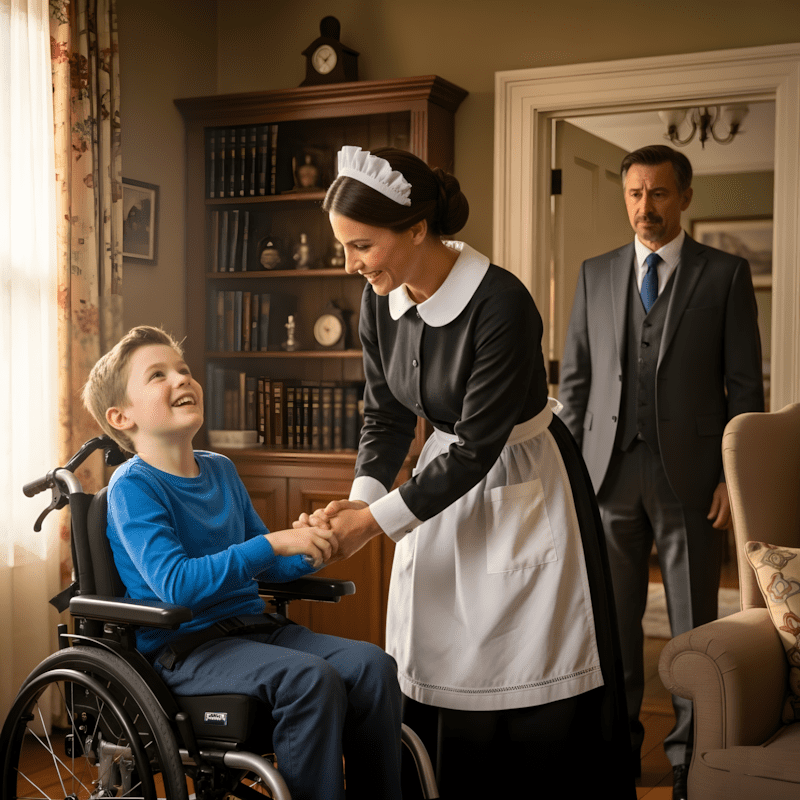 Daar, in het midden van de studeerkamer, was zijn zoon, Ethan—die sinds het ongeluk in een rolstoel zat—zo hard aan het lachen dat zijn wangen rood waren. De dienstmeid Clara hield zijn handen vast, haar zwarte uniform zwaaide terwijl ze zich op het ritme bewoog. Ze begeleidde hem in een soort zittende dans, draaide zijn stoel zachtjes in cirkels, haar ogen waren op de zijne gericht alsof de rest van de wereld niet bestond.