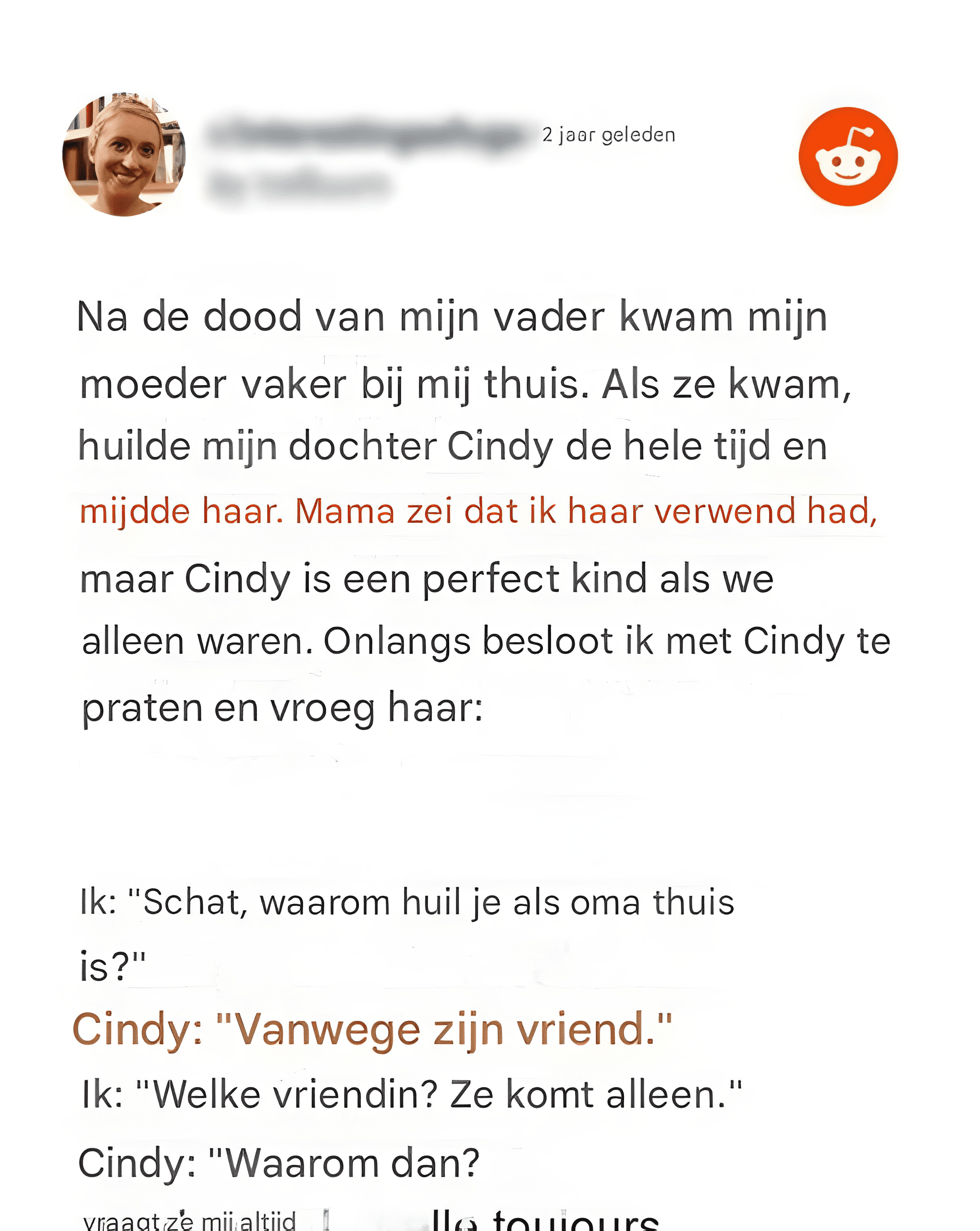Maar de laatste tijd, wanneer mijn moeder Cindy afzet, huilt mijn dochter de hele tijd en ontwijkt ze haar oma, terwijl mijn moeder me vertelt wat ze gedaan hebben.