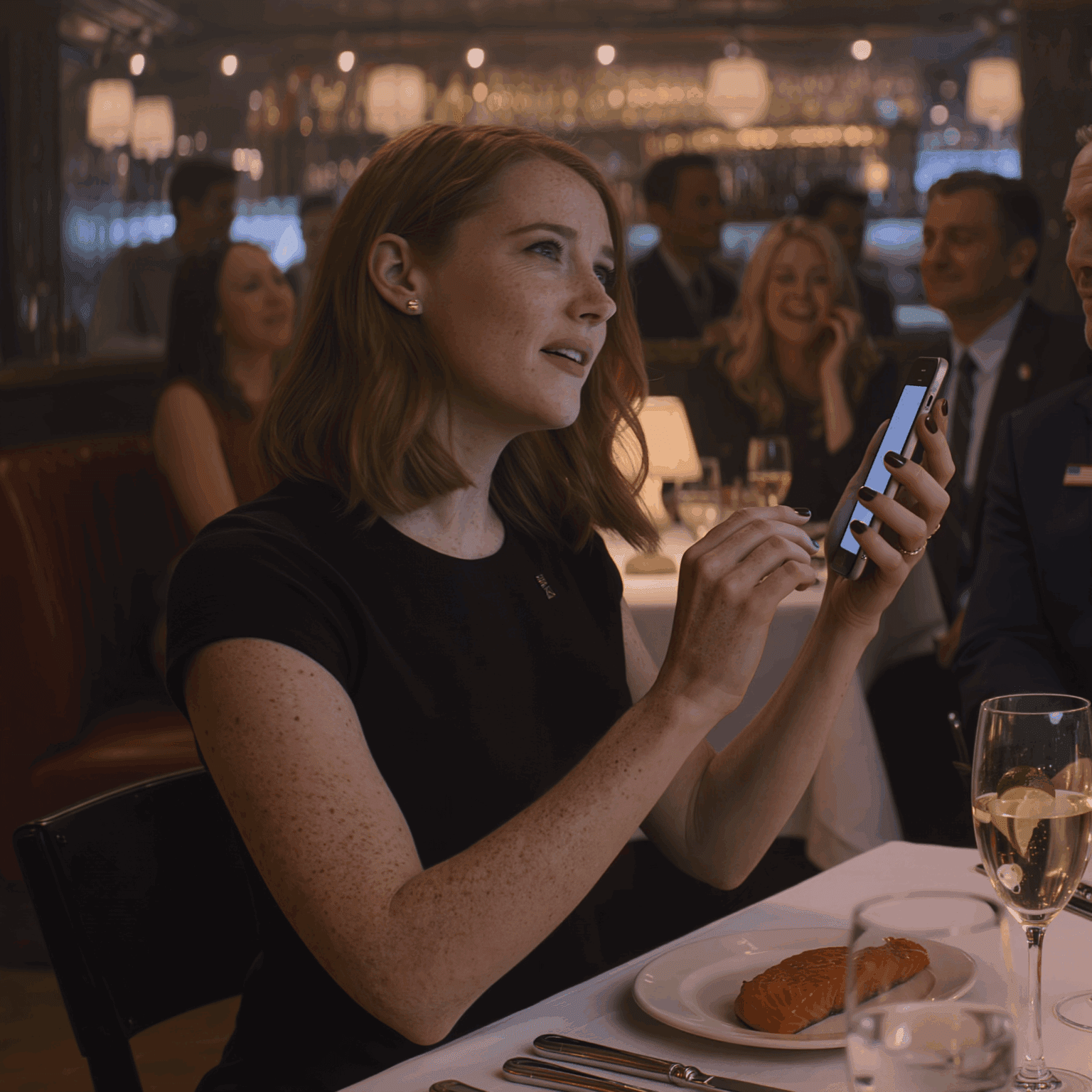 Sinatra klonk uit de luidsprekers aan het plafond terwijl de gastvrouw een leren menukaart naar me toe schoof, haar blazer vastgespeld met een klein Amerikaans vlaggetje. Een schijfje limoen kleefde aan mijn glas en vormde een perfecte ring van condens op Mortons gepolijste tafel. Mijn ouders zaten al, mijn zus Rachel straalde, en naast haar – 1 meter 88 lang, met een stralend gebit en strak gestyled haar – zat de man die het komende uur mijn leven tot een grap zou maken. Ik zette het bruisende water neer en voelde de kou door mijn vingertoppen. Hij had nog niet gezegd wat voor werk hij deed. Nog niet. Ik zei tegen mezelf dat ik moest ademen, luisteren, de kamer zijn gang moest laten gaan. Er zou een moment komen, en wanneer dat moment daar was, zou ik de feiten voorzichtiger op tafel leggen dan welk steakmes dan ook. Toen noemde hij het bedrijf waar hij werkte, en ik zette mijn glas op het onderzetje en pakte mijn telefoon.