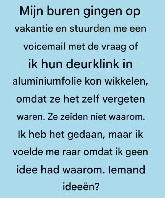 Toen mijn buren op vakantie waren, lieten ze me een voicemailbericht achter met de vraag of ik hun deurklink met aluminiumfolie wilde bedekken.