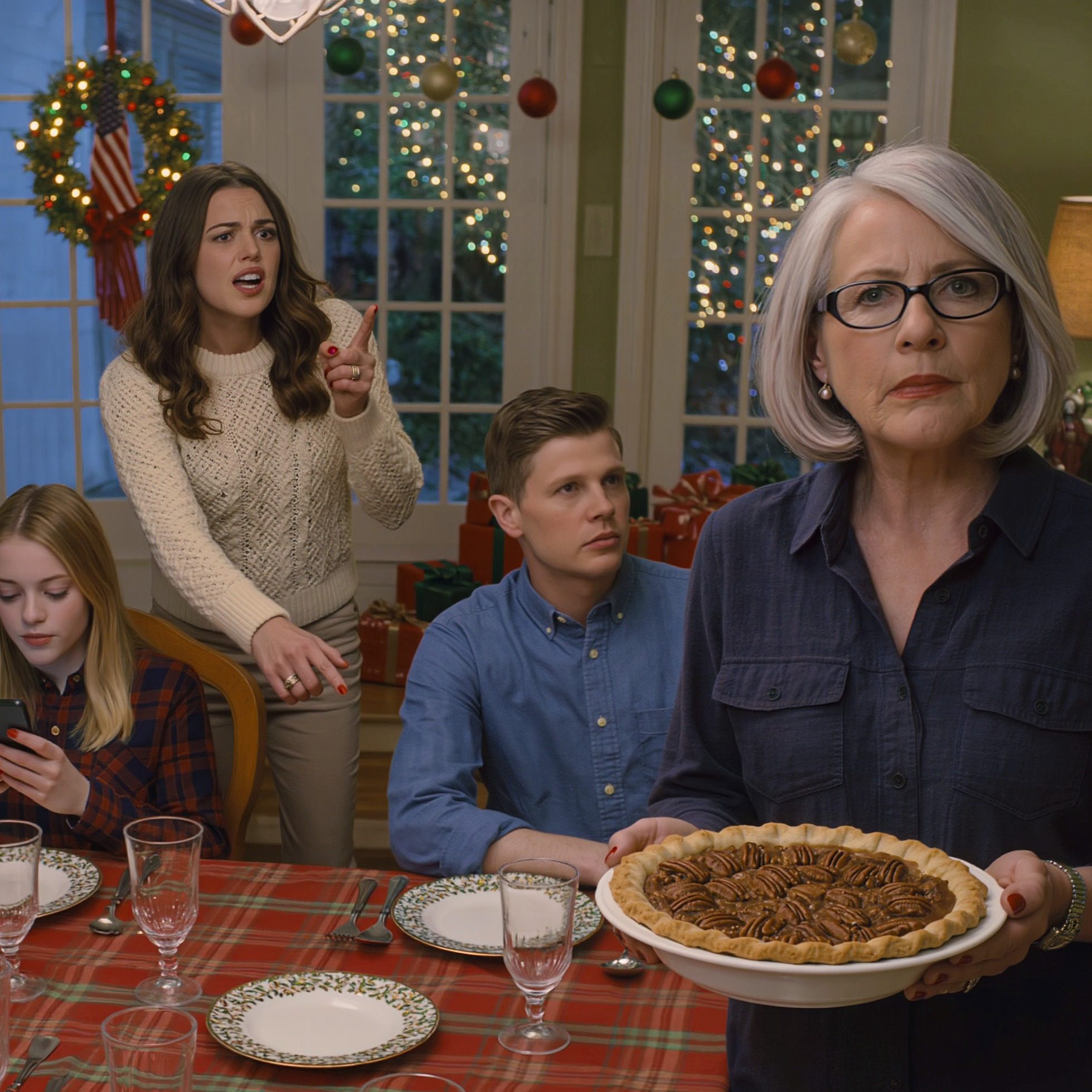 De pecannotentaart was nog warm in mijn handen toen het kerstdiner veranderde in een rechtszaal: mijn schoondochter stond op, boog zich over de tafel en kondigde aan dat ik twee opties had: 1200 dollar per maand ‘huur’ betalen of vertrekken. Ondertussen bleven de lampjes op de veranda knipperen en zat mijn eigen zoon stil in de stoel die zijn vader had gemaakt, alsof dit zijn moeder niet overkwam.