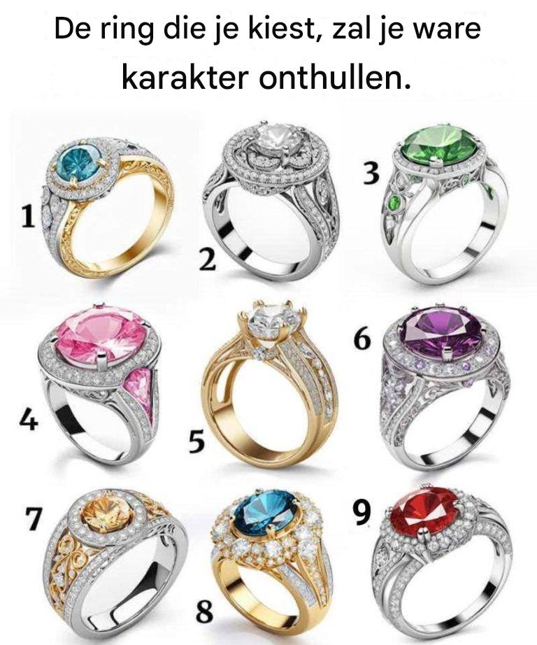 Sieraden zijn al lang meer dan alleen decoratie. Eeuwenlang hebben mensen geloofd dat de accessoires die we mooi vinden, diepere lagen van onze persoonlijkheid onthullen. Vooral ringen – die dicht bij de pols worden gedragen – zouden onze innerlijke essentie blootleggen. Neem dus even de tijd om de negen prachtige ringen hierboven te bekijken en kies de ring die je ziel raakt. De ring die je oog als eerste trekt, onthult misschien wel je ware karakter.