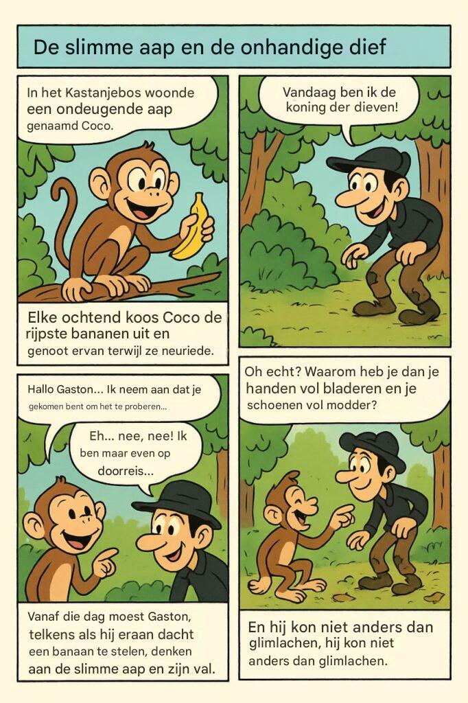 In het Kastanjebos woonde een ondeugende aap genaamd Coco. Elke ochtend koos Coco de rijpste bananen uit en genoot ervan terwijl hij een melodietje neuriede.