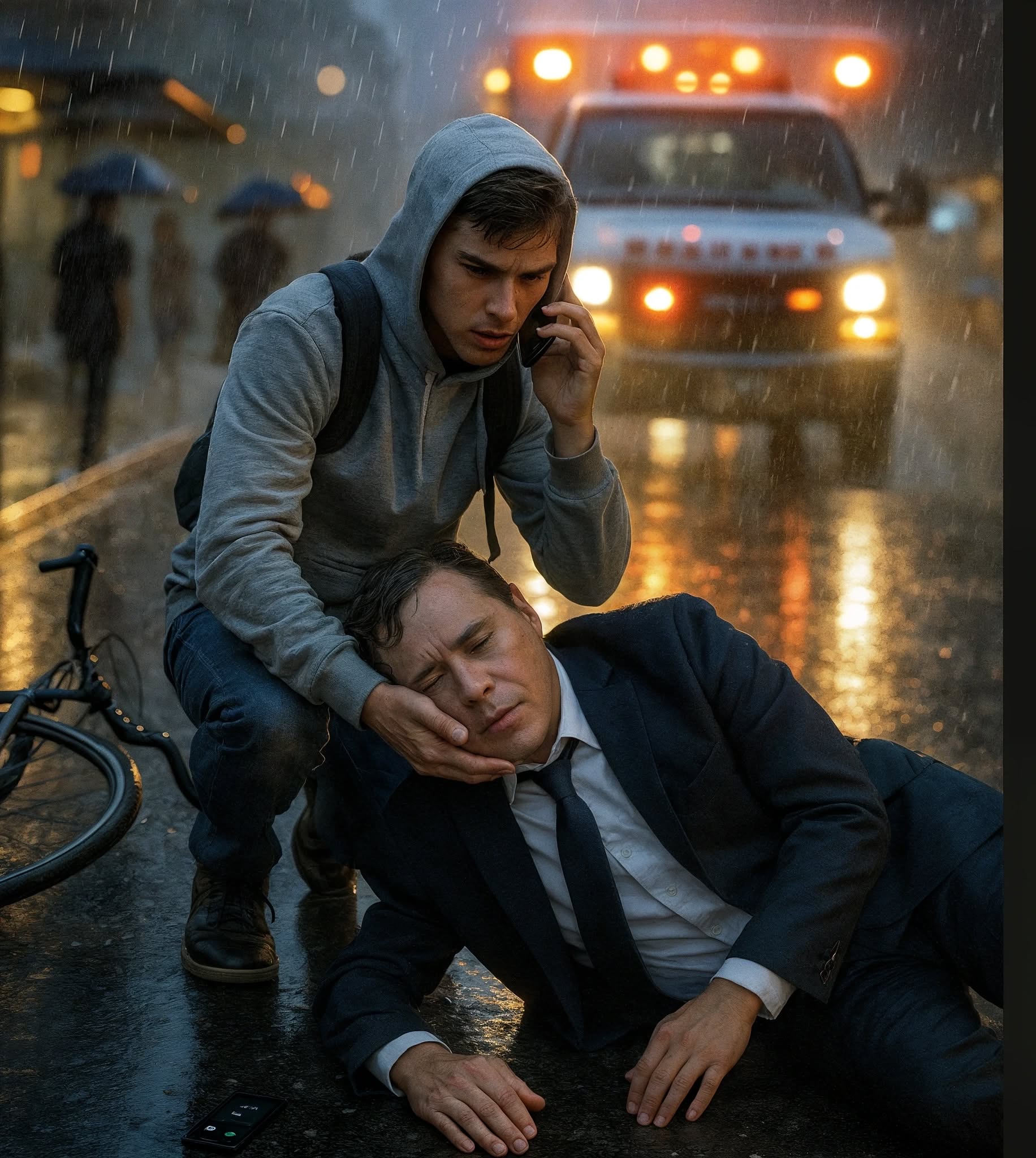 Een man in een donkerblauw pak lag ineengedoken bij een bushalte, zijn gezicht naar de stoep gericht. Haastige voorbijgangers wierpen een blik op hem en liepen vervolgens verder. Ethan vertraagde – slechts even – het examen, zijn toekomst, alles drukte zwaar op hem. Zijn geweten liet hem niet verdergaan.