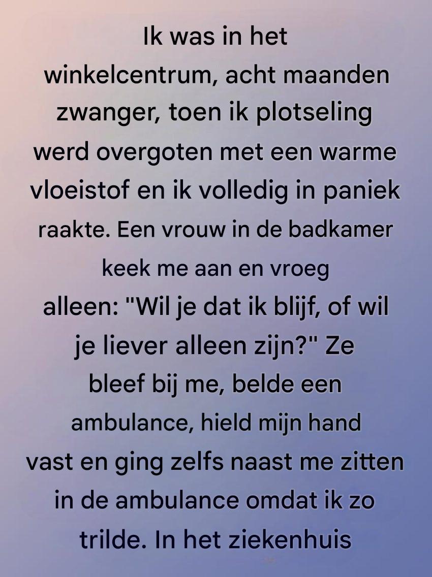 Hij bleef de hele tijd bij me, belde de ambulance, hield mijn hand vast en stapte zelfs naast me in de ambulance omdat ik zo erg trilde.