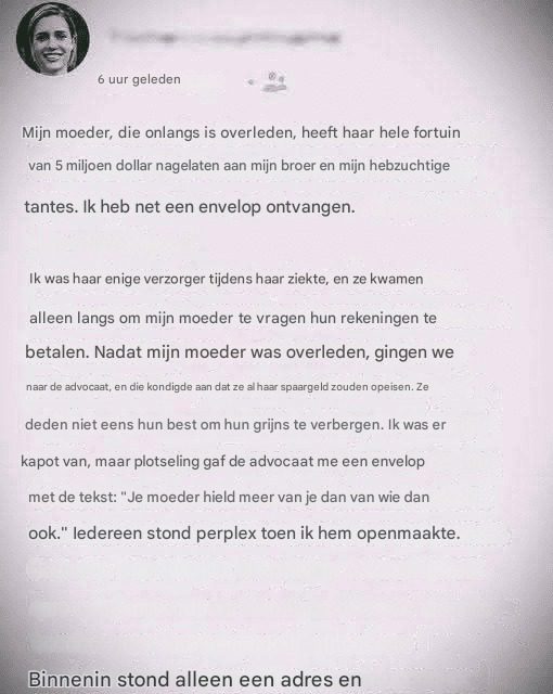 Maar omdat ze er altijd voor haar moeder was, kwamen haar hebzuchtige broer en tantes alleen bij haar langs als ze iets nodig hadden, meestal geld om hun rekeningen te betalen.