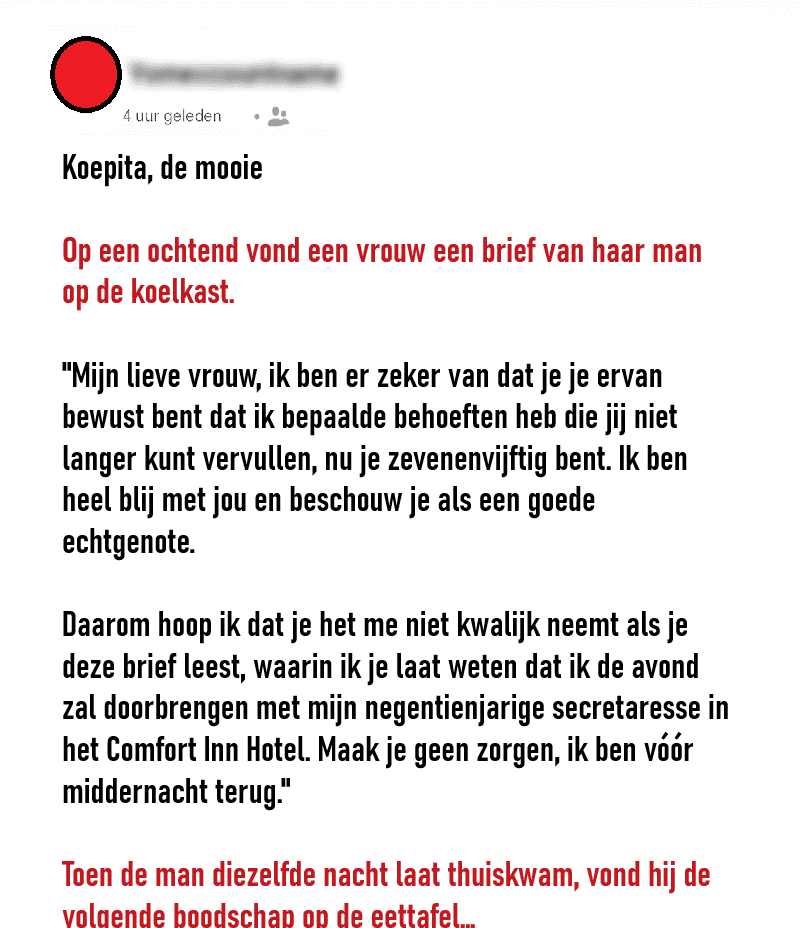 Stel je voor dat je op een ochtend wakker wordt en een briefje van een geliefde vindt, achteloos op de koelkast geplakt. Het ontvouwt zich als een brief die bedoeld is om je te troosten, maar met een einde waar je je ochtendkoffie van zou uitspugen. Ons verhaal begint precies zo: met een vrouw die een brief van haar man vindt. Het gaat ongeveer zo:
