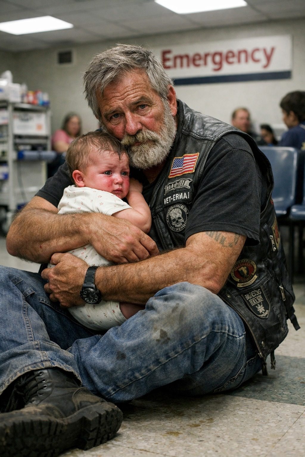 Deze motorrijder zat twaalf uur lang op de grond met mijn zieke baby in zijn armen, terwijl ik zijn uiterlijk verafschuwde.