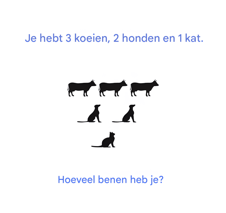 Je hebt 3 koeien, 2 honden en 1 kat. Hoeveel poten heb je?