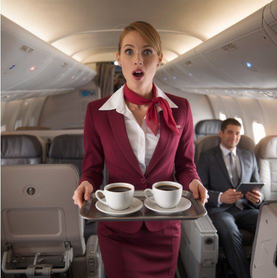 ‘Chloe, zou je de passagiers op stoelen 1A en 1B willen helpen? Ze hebben zwarte koffie zonder suiker besteld,’ zei mijn hoofdstewardess, Angela, waardoor ik uit mijn gedachten werd gerukt.