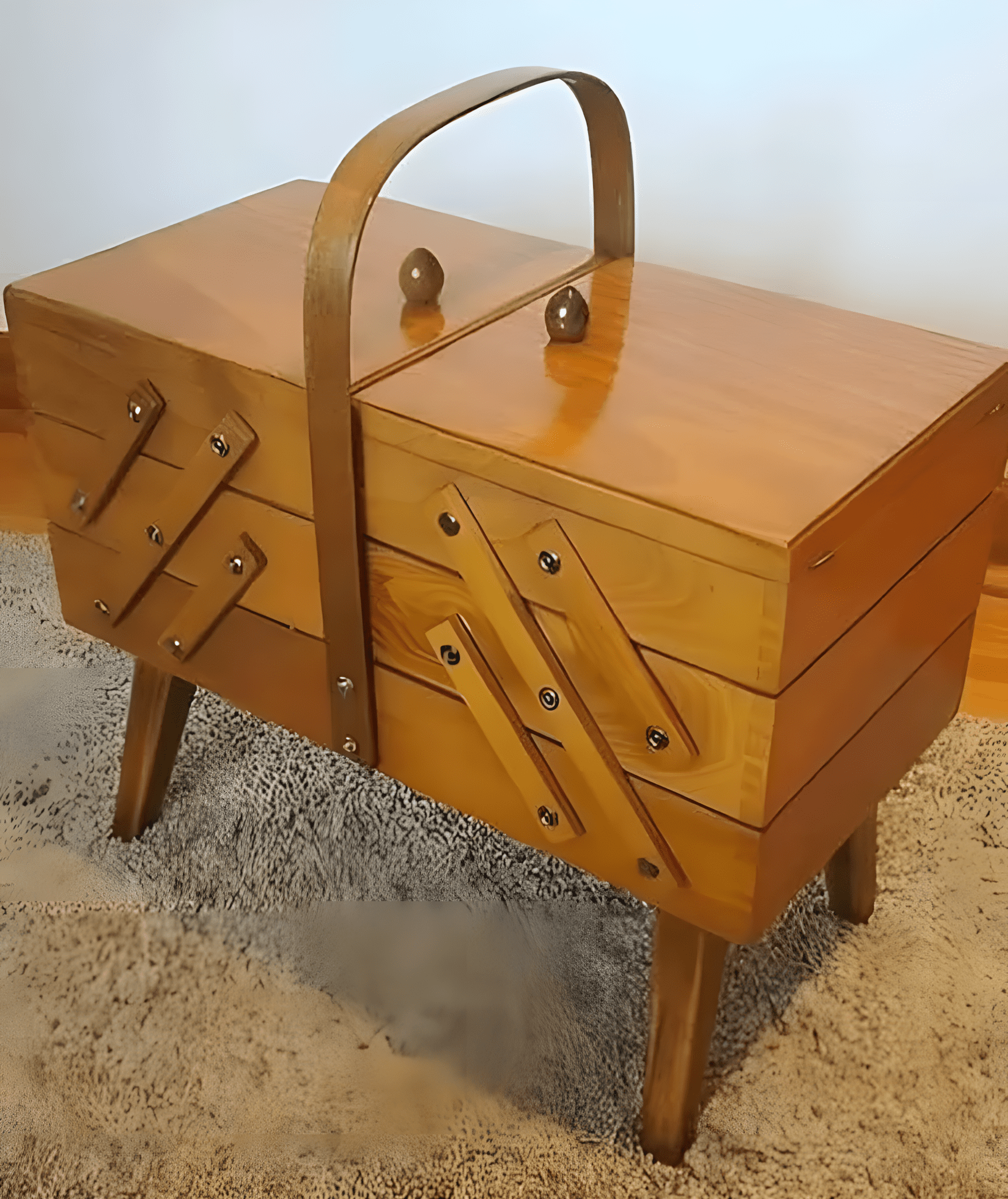 Wat u voor ogen heeft, is een authentieke,  opvouwbare naaidoos , vaak gemaakt van gelakt hout, soms prachtig gesneden. Een echte must-have in huizen van midden 20e eeuw, het was  het onmisbare gereedschap  voor naailiefhebbers. Met zijn ingenieuze compartimenten die als een trap openklappen, hield hij alles netjes bij elkaar: klossen, naalden, vingerhoeden, scharen, knopen… een ware schat!