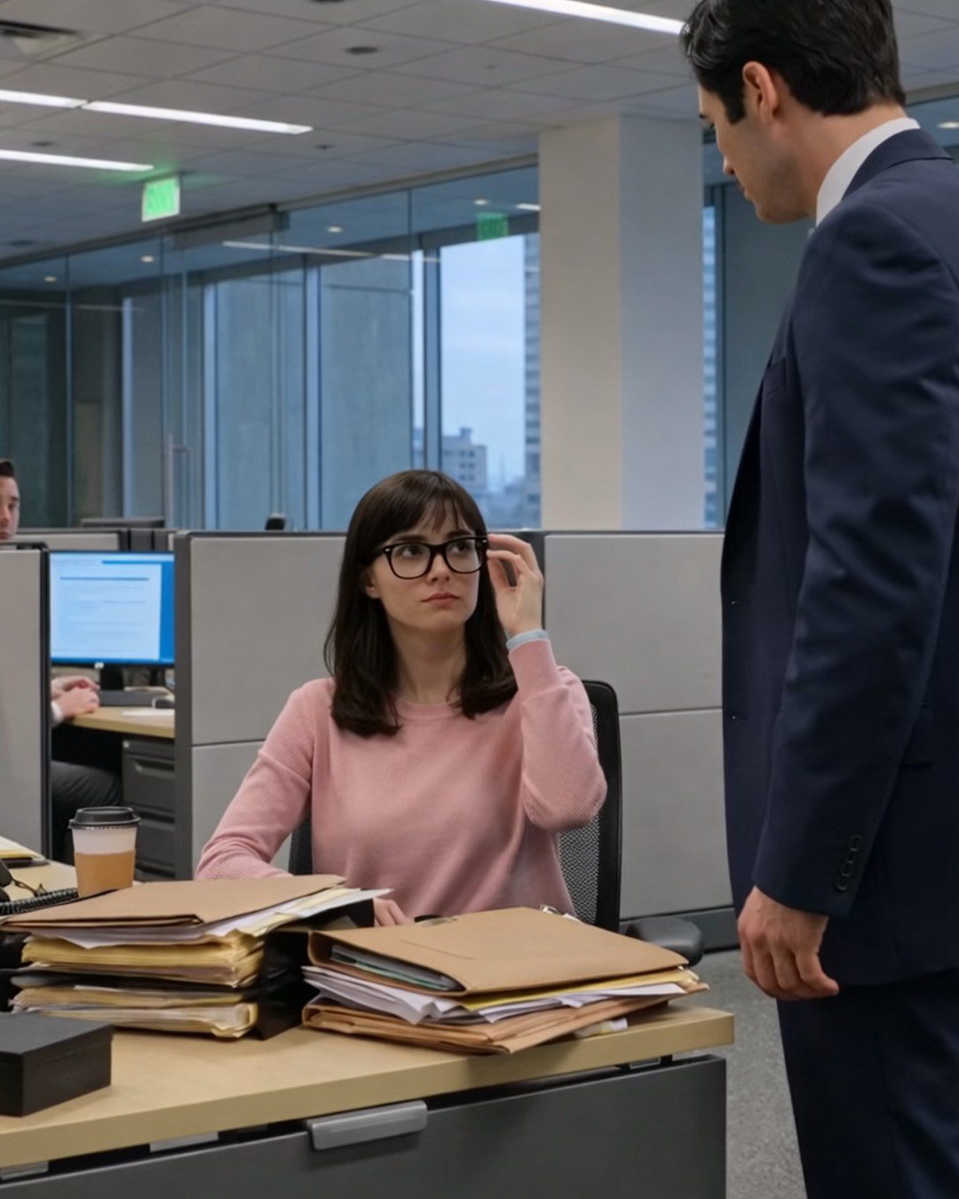 Daar zat ik in de hoek – een onopvallende stagiaire in burgerkleding, verscholen achter stapels dossiers, met een goedkope bril met zwart montuur en de uitdrukking van een meisje dat niemand zich meer herinnerde.