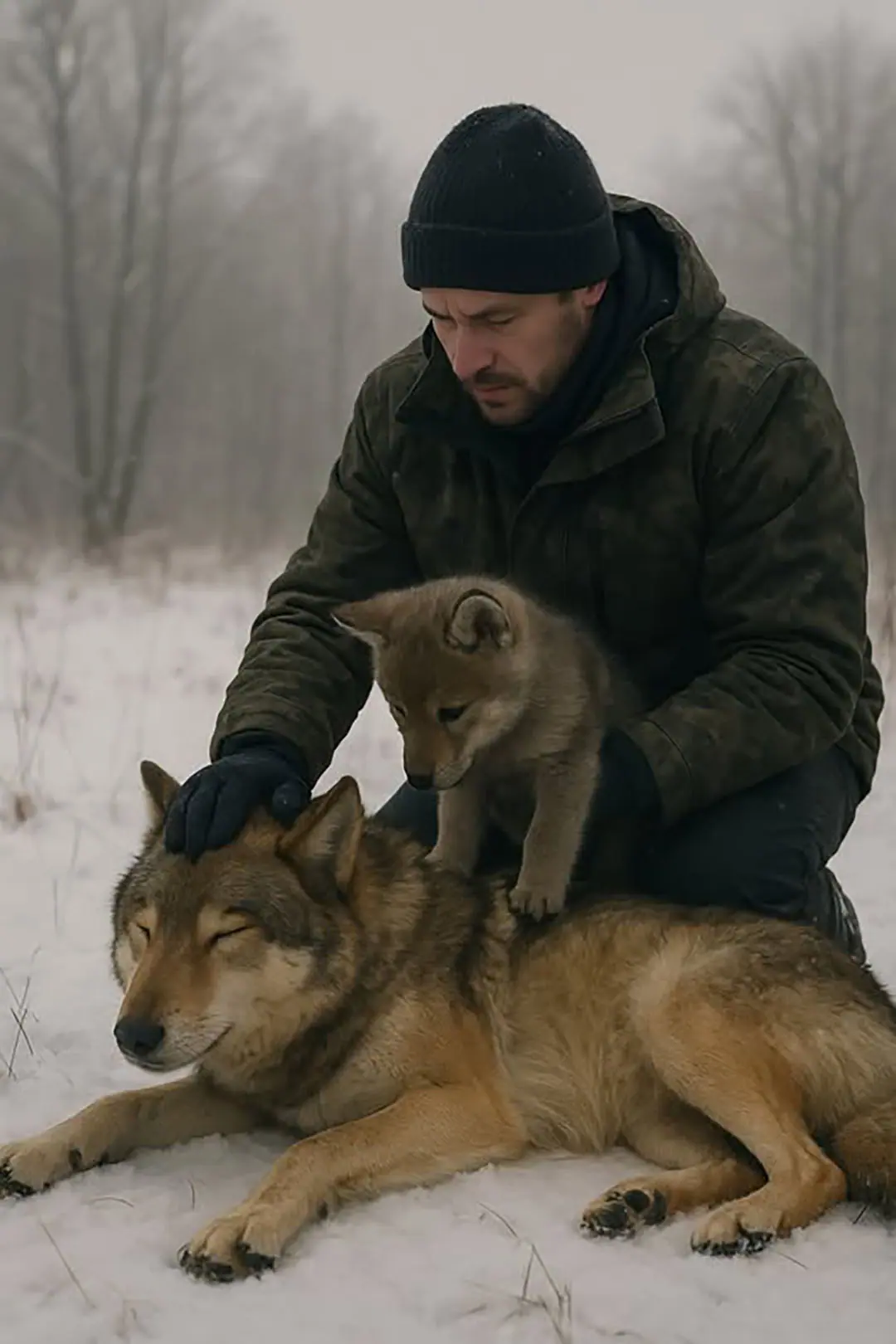 Terwijl hij een groot, met sneeuw bedekt veld overstak, zag hij een bewegingloze, donkere gestalte, half verborgen onder de sneeuw. Zijn eerste instinct was om weg te lopen. Maar iets aan het tafereel trok zijn aandacht: een jonge wolvenwelp cirkelde rond de figuur en begreep niet waarom deze niet opstond.