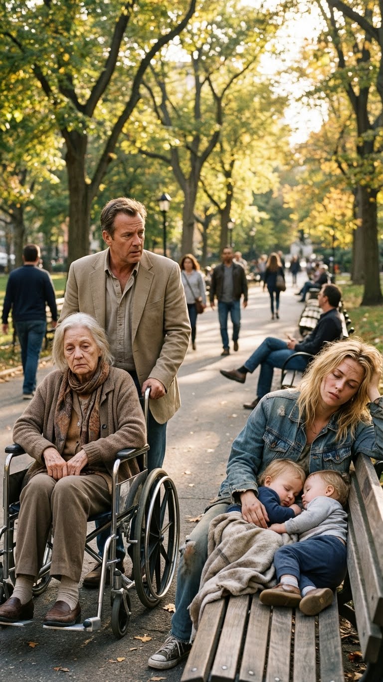 Een miljonair nam zijn moeder mee voor een rustige wandeling in het park, maar verstijfde toen hij zijn ex-vrouw slapend op een bankje zag liggen met drie baby’s.