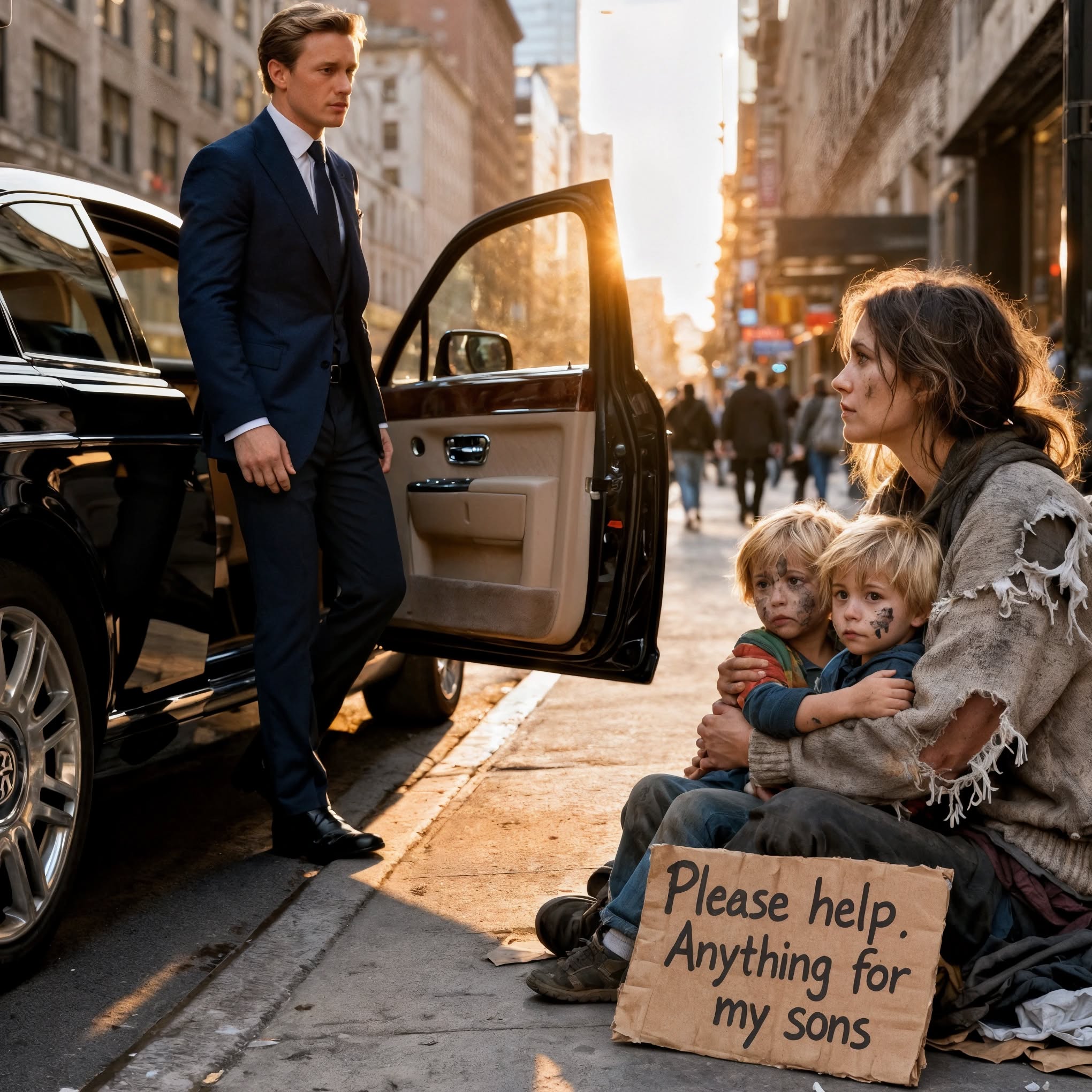 Terwijl hij Madison Avenue opliep richting zijn kantoortoren, viel zijn oog op iets ineengedoken figuur op de hoek. Een vrouw zat op de ijzige stoep met een stuk karton in haar handen. Naast haar grepen twee jongetjes van ongeveer drie jaar oud, met warrig blond haar, haar mouwen vast met hun kleine handjes. Op het karton stond: