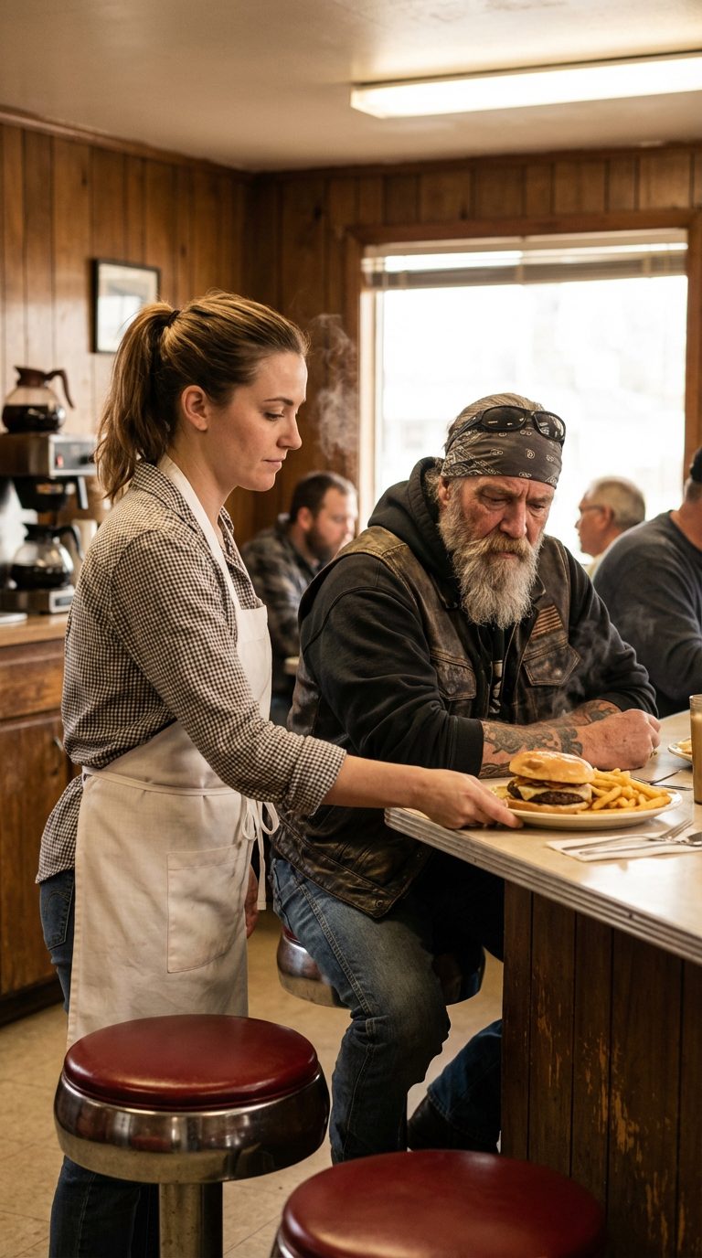 Haar hand bewoog instinctief naar de paniekknop onder de toonbank toen de deur krakend openging. Een man strompelde naar binnen, regenwater druipend van een door de storm donker geworden leren vest. Hij zag er wankel uit, alsof hij moeite had om overeind te blijven.