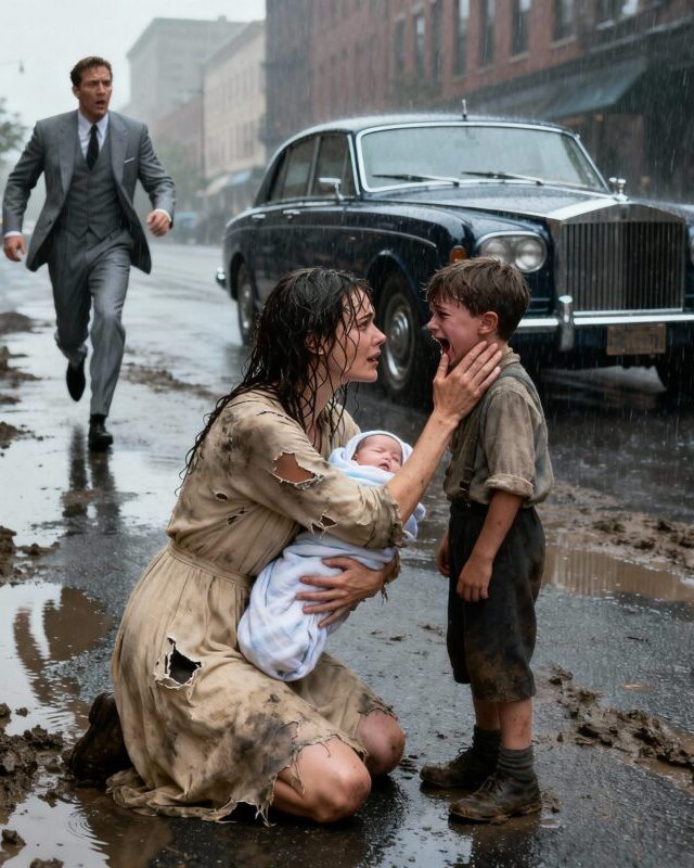 De vrouw probeerde de jongen warm te houden, haar pasgeborene stevig in haar armen te sluiten en hen beiden tegen de regen te beschermen. Ze dacht na over hoe ze het kind kon helpen, maar kon niet besluiten wat ze moest doen.