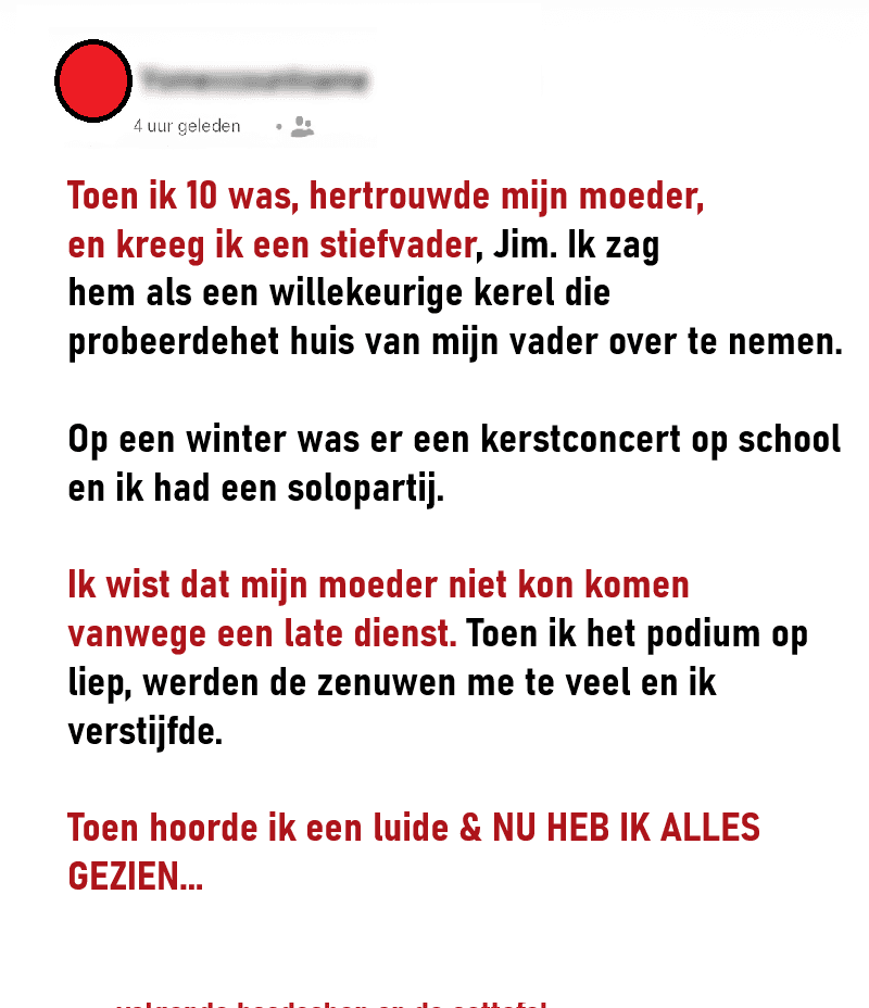 Toen ik 10 was, begon mijn moeder aan een nieuw hoofdstuk in haar leven door te trouwen met Jim, die mijn stiefvader werd. Aanvankelijk zag ik hem als een buitenstaander, iemand die probeerde een rol te vervullen die niet de zijne was. Ik hield hem op afstand, aarzelend om hem in mijn wereld toe te laten. Die winter organiseerde mijn school een kerstconcert en ik had een kleine solorol verdiend. Mijn moeder, die een late dienst had, kon er niet bij zijn, wat ik begreep, maar toch voelde ik de pijn van haar afwezigheid. Toen mijn moment om op te treden aanbrak, stapte ik het podium op, staarde naar het publiek en voelde me plotseling verlamd van angst.