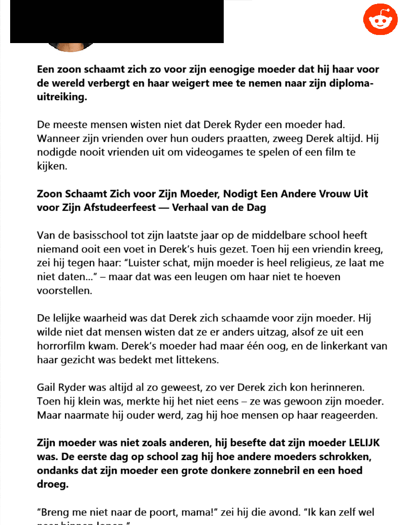 De lelijke waarheid was dat Derek zich schaamde voor zijn moeder. Hij wilde niet dat mensen wisten dat ze er anders uitzag, alsof ze uit een horrorfilm kwam. Derek’s moeder had maar één oog, en de linkerkant van haar gezicht was bedekt met littekens.