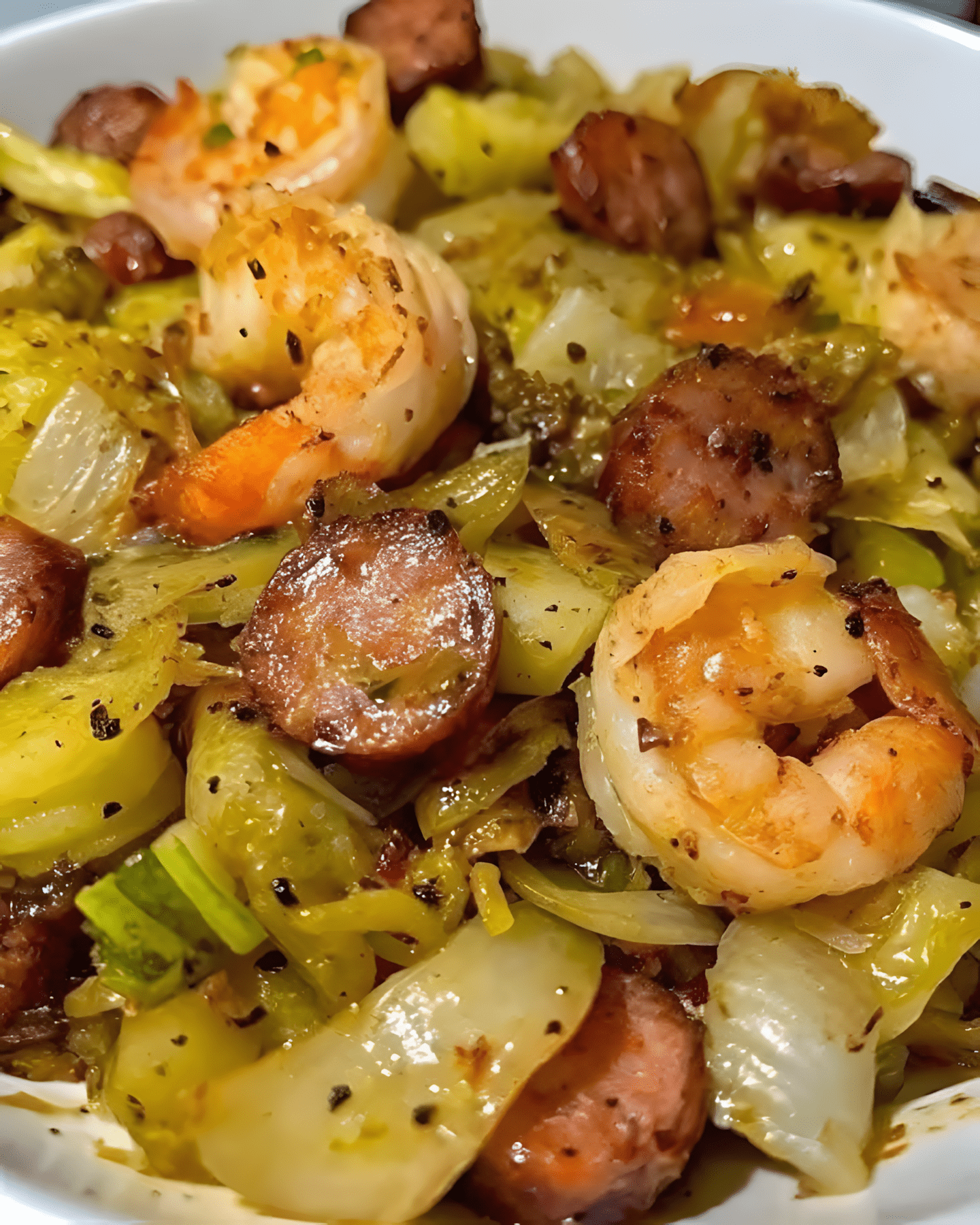 Een smaakvol, stevig en makkelijk te maken eenpansgerecht met malse garnalen, rokerige worst en gekarameliseerde kool. Perfect voor een snelle avondmaaltijd of als meal prep!