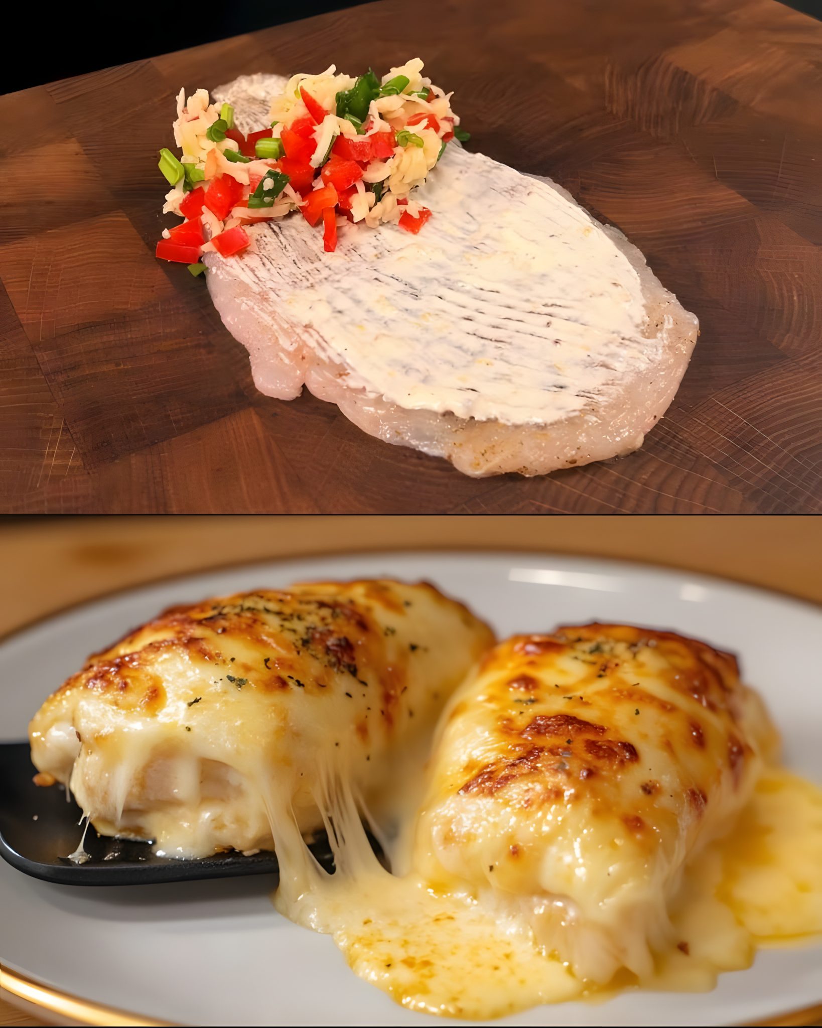 Wil je een heerlijk en voedzaam gerecht dat zowel smeuïg als hartig is? 🤩 Deze sappige gevulde kipfilet is gevuld met een smakelijke mix van rijst, groenten en gesmolten kaas! 🥕🧀 Perfect voor een luxe doordeweekse maaltijd of een feestelijk diner. De combinatie van malse kip, geurige kruiden en smeuïge vulling zorgt voor een gerecht dat je keer op keer wilt maken! 🍽️✨