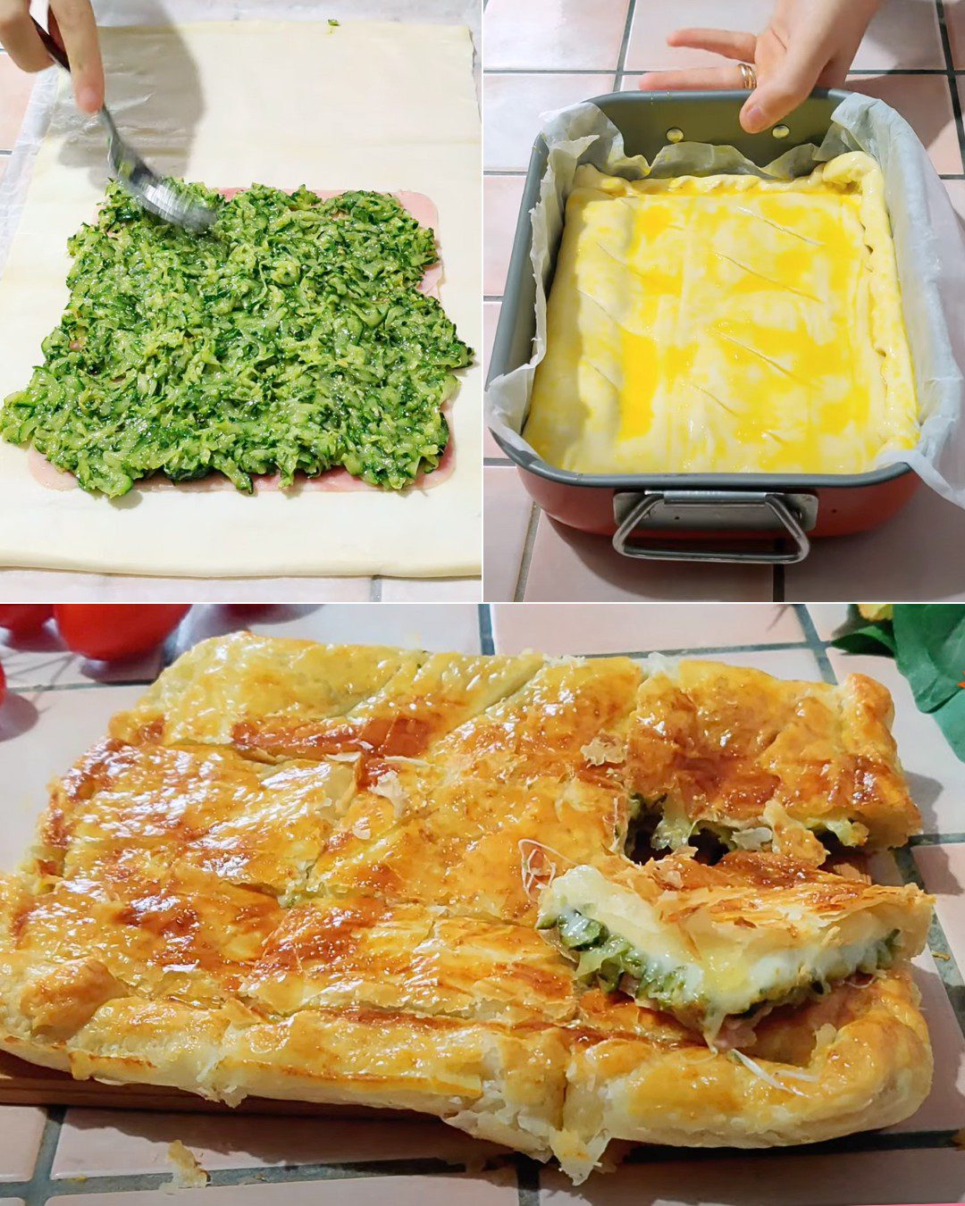 Een goudbruin bladerdeeg gevuld met smeuïge courgette, gesmolten kaas en plakjes ham – eenvoudig, snel en overheerlijk!