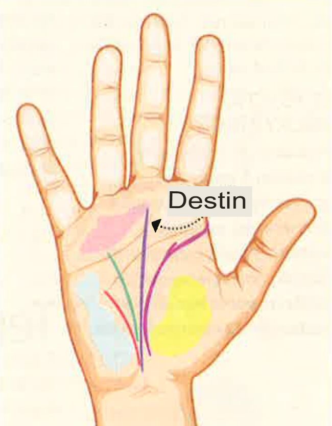 De lotlijn, die loopt van de handpalm tot de basis van de middelvinger (Saturnusvinger), onthult de belangrijkste gebeurtenissen in het leven. Vaak verdeelt de lotlijn de handpalm in twee helften. Als de duim/wijsvinger prominenter is dan de pink/ringvinger, heeft ons professionele leven voorrang op ons privéleven. En vice versa.