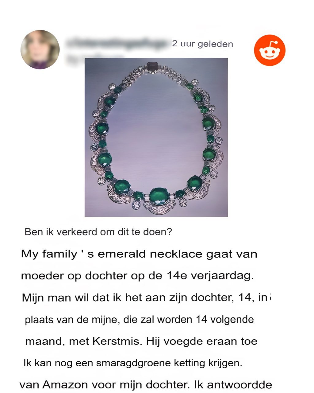Een vrouw bevond zich in een lastige situatie met betrekking tot een gekoesterd familie-erfstuk: een smaragden ketting die traditioneel aan het oudste kind wordt doorgegeven op hun 14e verjaardag. De ketting was bedoeld voor haar dochter, Emily, maar haar man, Joey, stelde voor om hem aan zijn dochter uit een eerder huwelijk, Sophia, te geven als gebaar van inclusie in hun nieuwe samengestelde gezin.