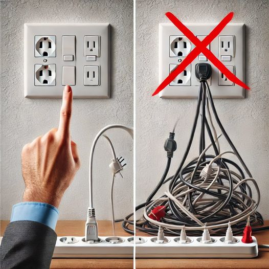 Rommel veroorzaakt door verwarde of overbelaste kabels in stekkerdozen verhoogt het risico op oververhitting en kortsluiting. In de afbeelding zien we twee voorbeelden: de eerste foto toont een nette opstelling met een enkele, overzichtelijke kabel, terwijl de tweede afbeelding verwarde en overbelaste kabels toont met een rood kruis dat een slecht voorbeeld aangeeft. Overbelaste stekkerdozen kunnen uw apparaten beschadigen of zelfs elektrische brand veroorzaken.