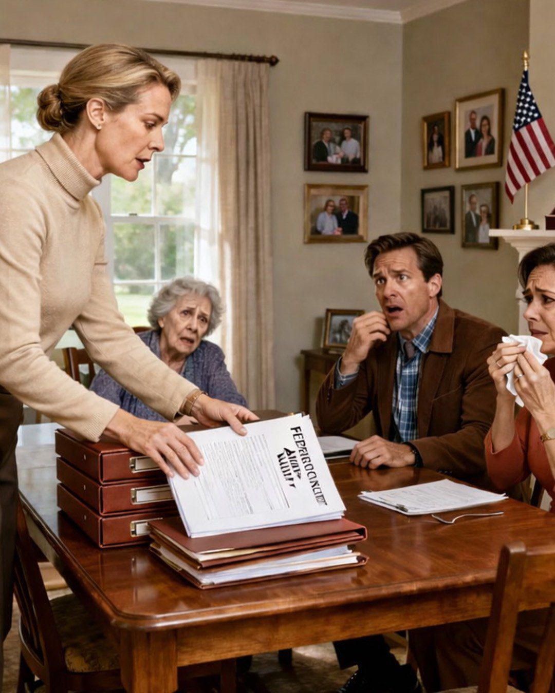 Naast hem knikte Patricia plechtig. Mijn schoonzus depte met een zakdoekje in haar ooghoek alsof ze een tragedie op een zondagavonddrama zag ontvouwen. Ze droeg een crèmekleurige trui die bij haar parels paste, haar haar zo perfect gekapt dat het leek alsof het nog nooit een windvlaag had gezien.