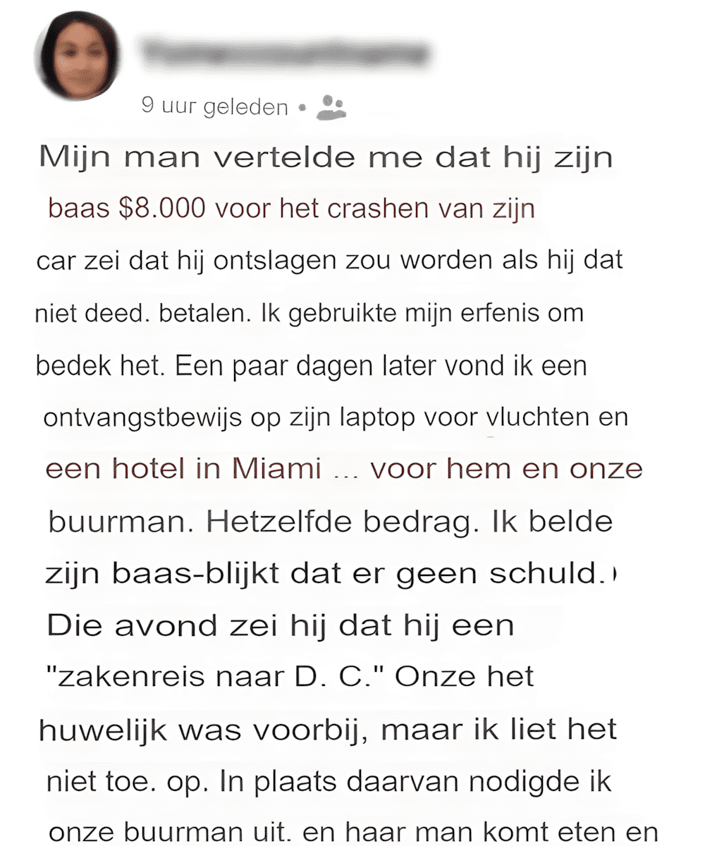 Hetzelfde bedrag dat Mike beweerde « verschuldigd » te zijn. Nog steeds hopend dat er iets mis was, belde ik zijn baas, die me vertelde dat er geen ongeluk was gebeurd.