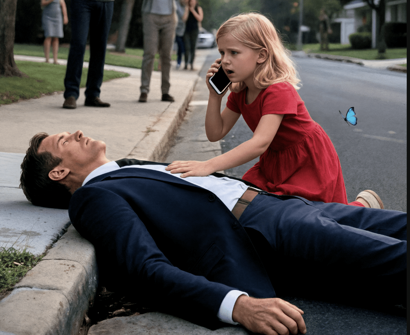 Ze verstijfde bij het geluid van een doffe klap en zag toen de man vallen. Zonder na te denken rende ze naar hem toe, legde haar kleine hand op zijn borst en fluisterde: « Hij ademt. »